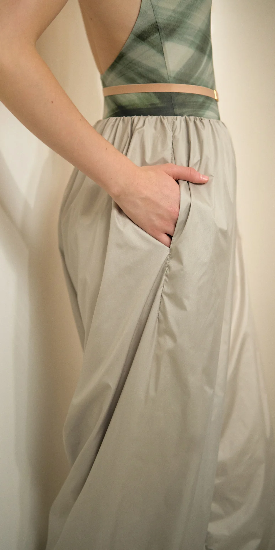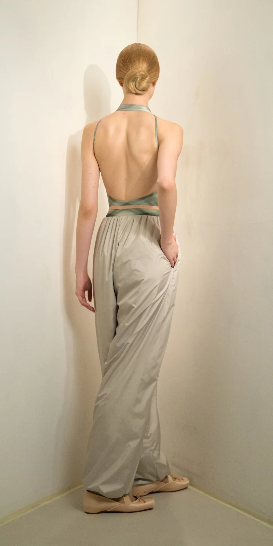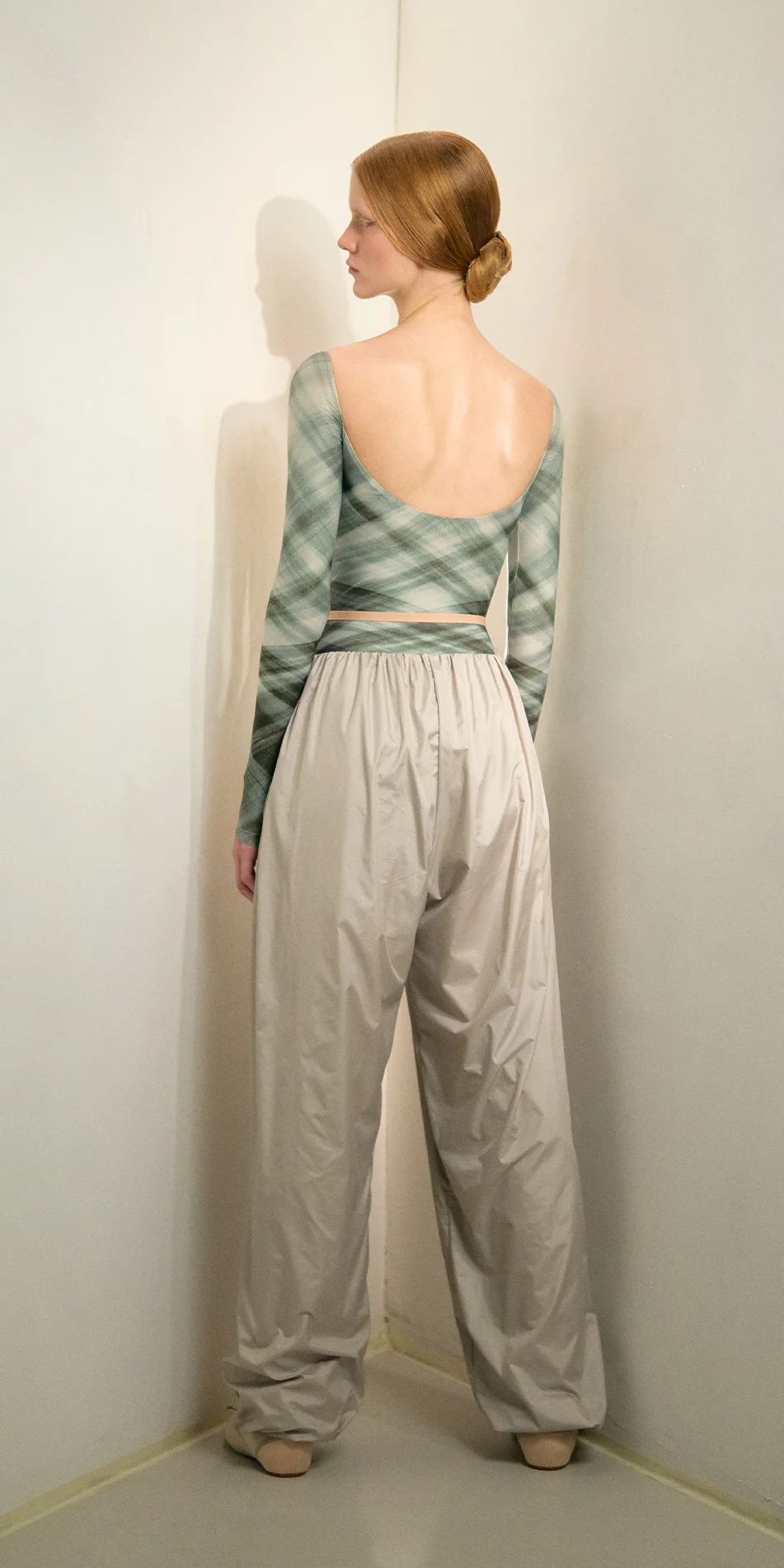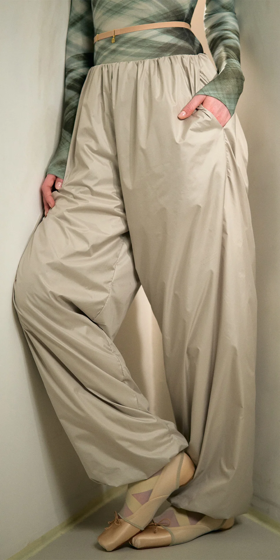 Taking cues from the ballet warm-up pieces, these baggy pants explore a soft, voluminous silhouette that contrasts with fitted leotards and tops. The relaxed shape offers comfort and ease, while maintaining a contemporary, studio-inspired look.
