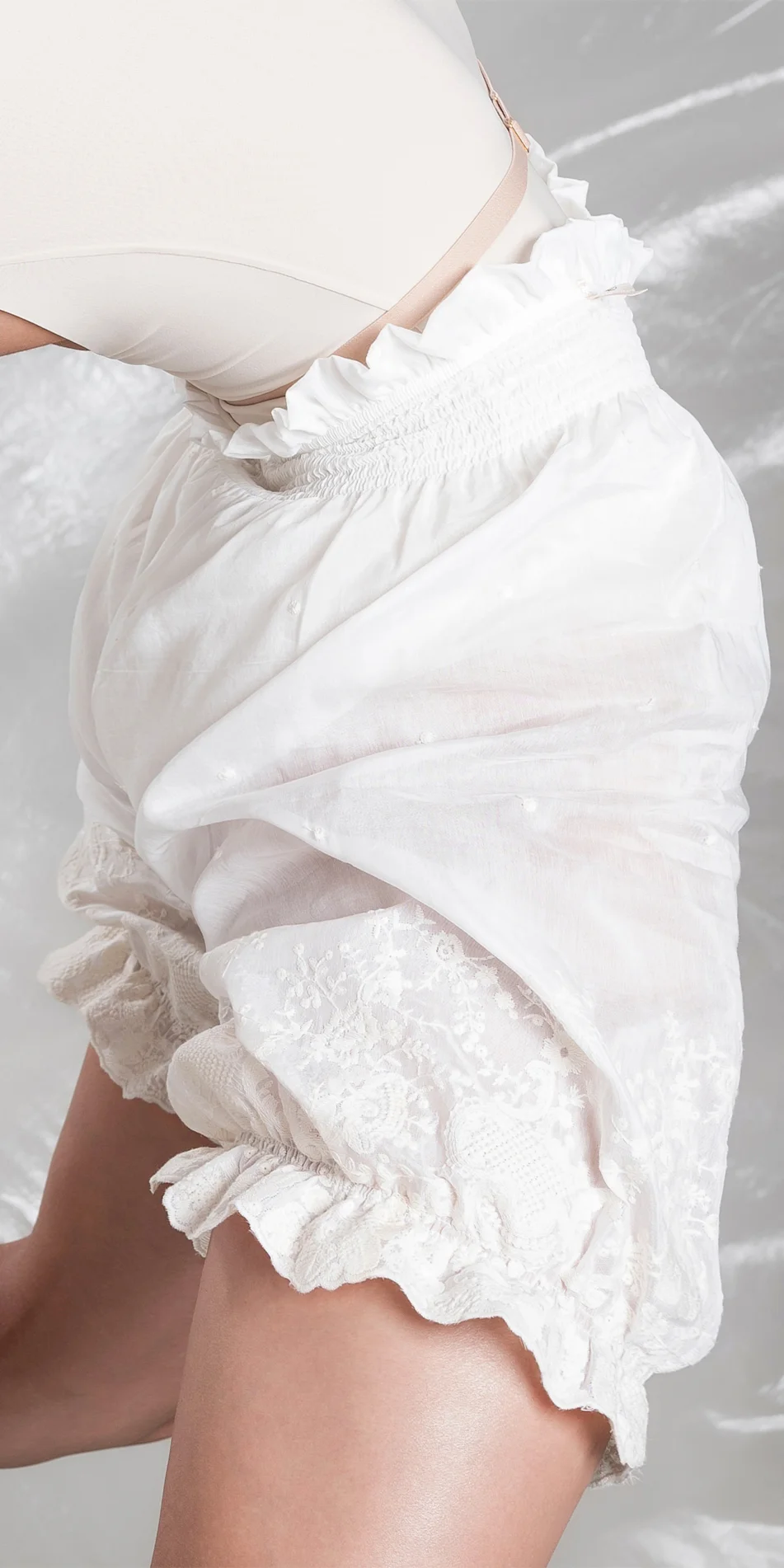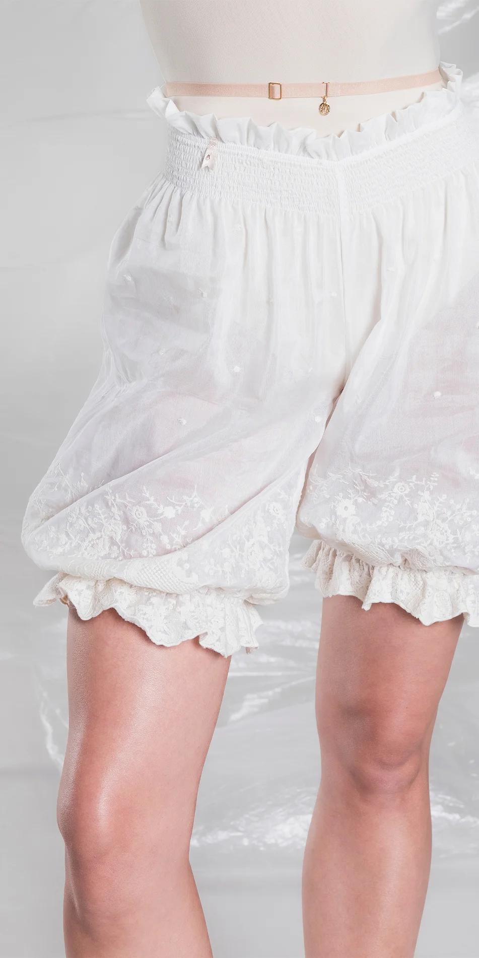 The bloomers translate historical references from 19th century undergarment into a modern silhouette, presented in a bermuda length. Elastic smock detailing and embroidery add a delicate character to the piece.