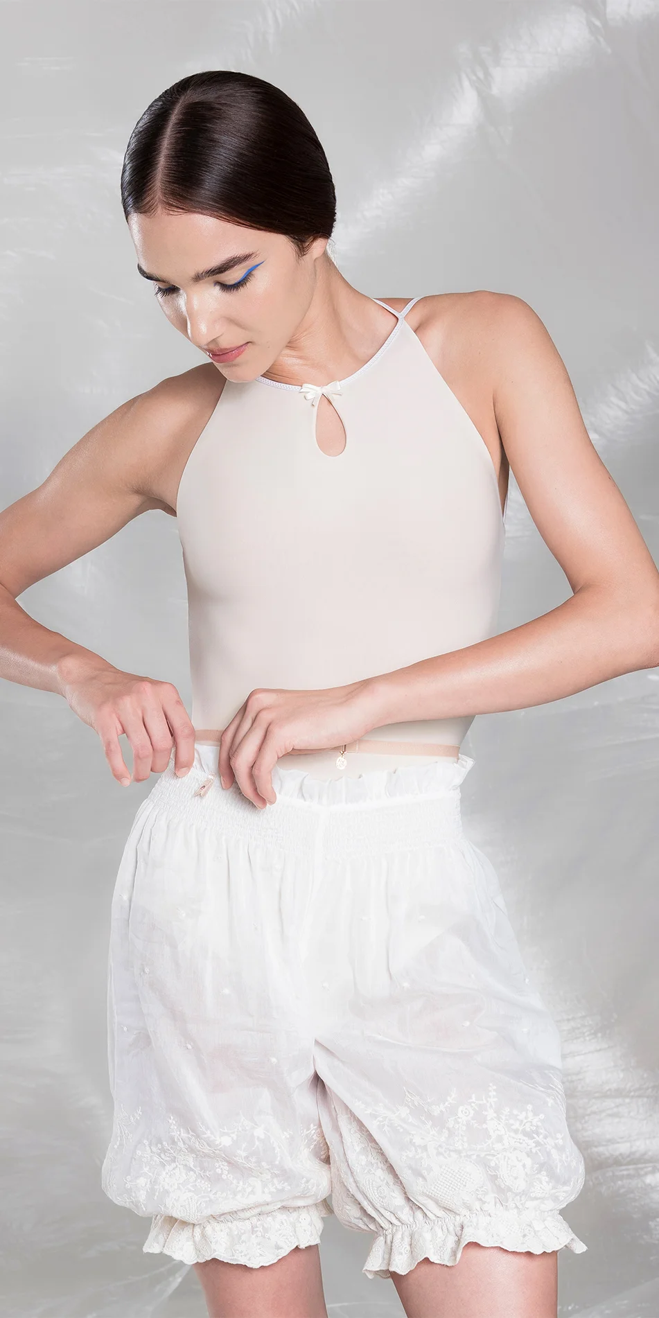 They can serve as fully functional ballet shorts or as a distinctive piece for a daily wardrobe. Offered in shades of Edelweiss and Pearl blush.