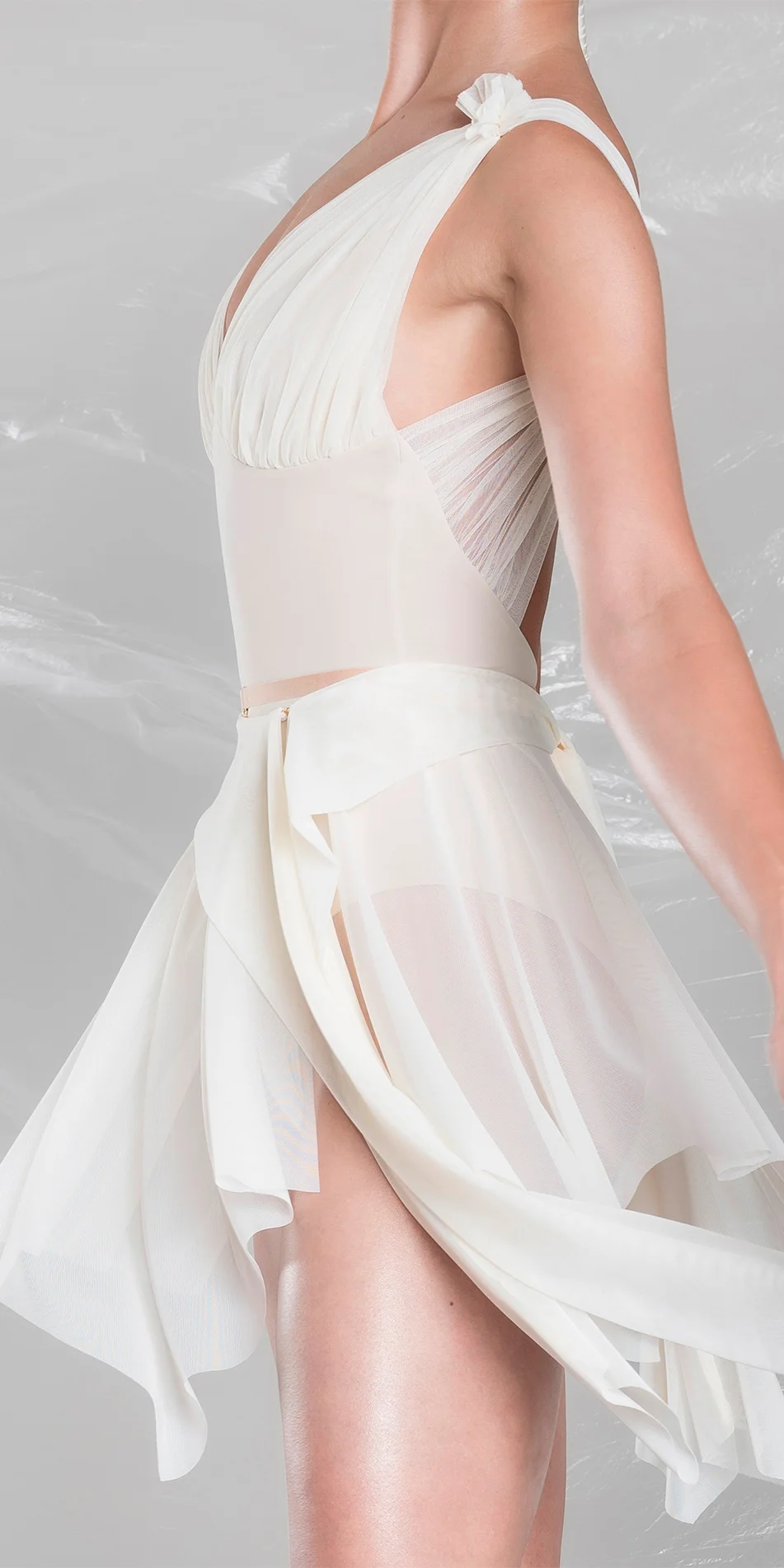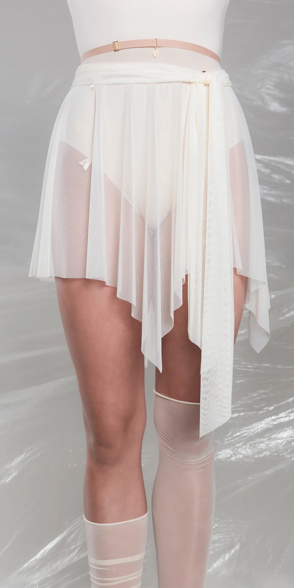Made from soft Italian stretch mesh, it provides light coverage without restricting movement. An asymmetrical hem with extended ties at the front and back creates a fluid, sculptural motion. A small hook closure secures the skirt in place.