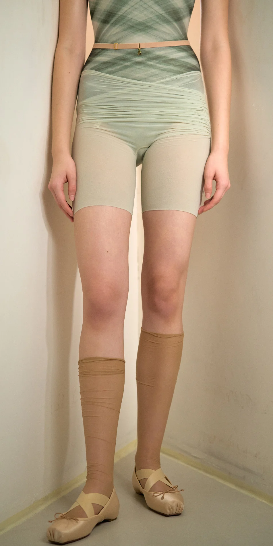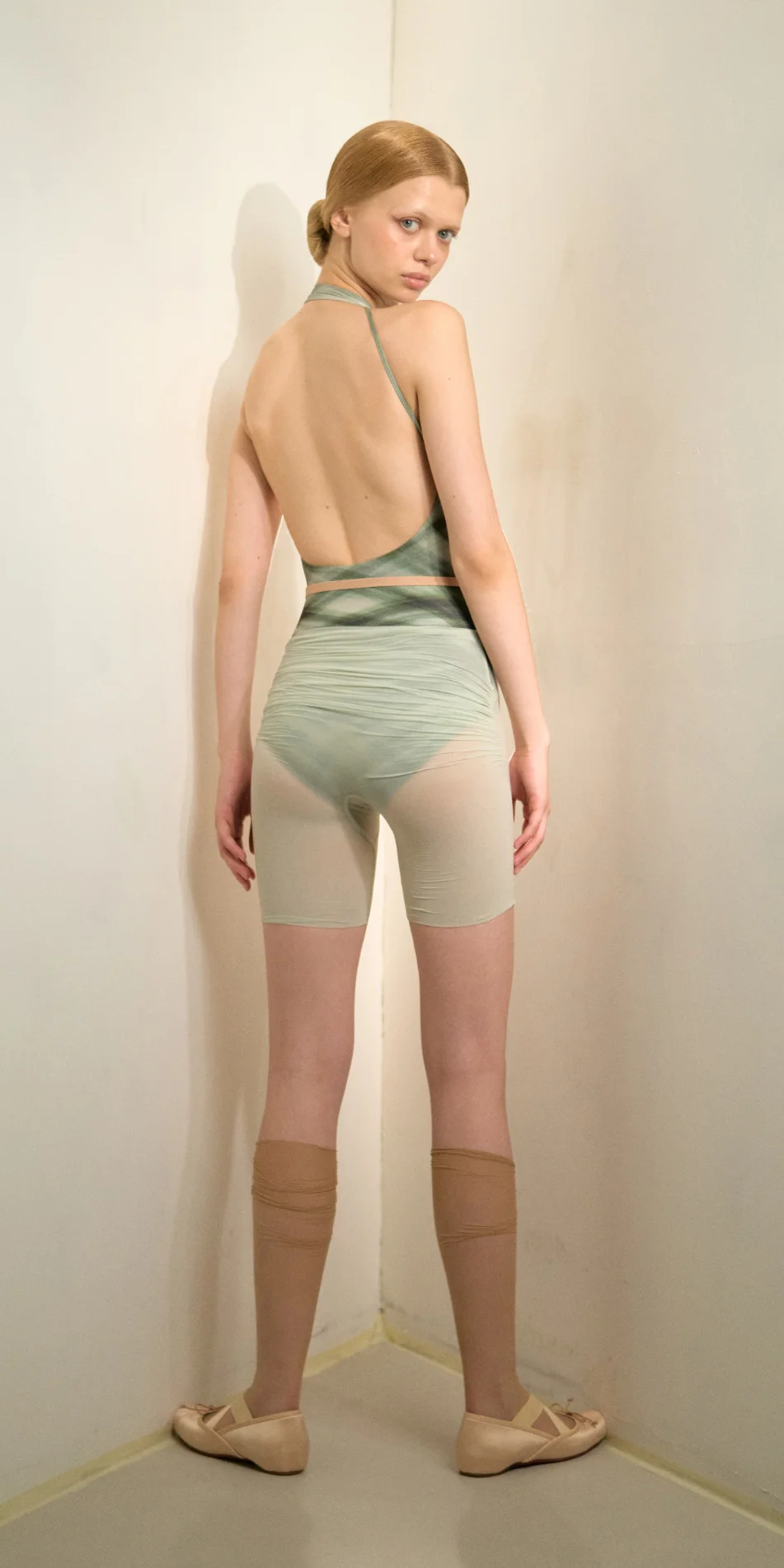Drawing inspiration from the spontaneous ways dancers repurpose their tights, this piece translates that creativity into a contemporary form of bike-shorts.