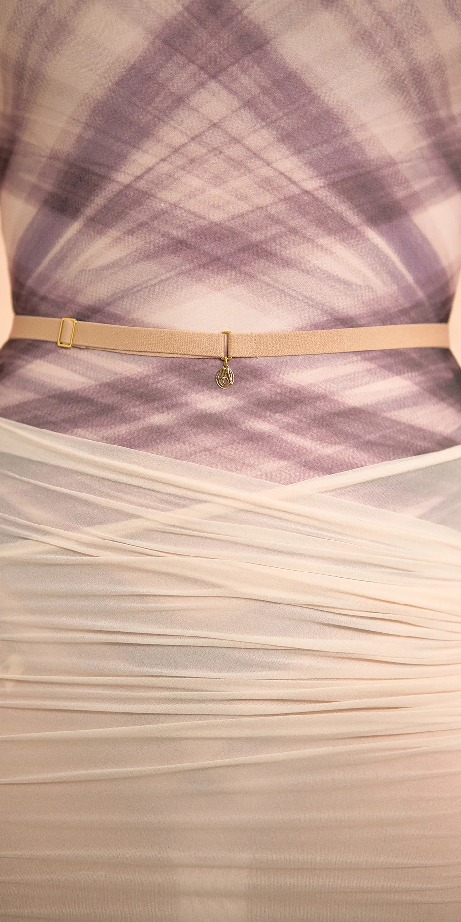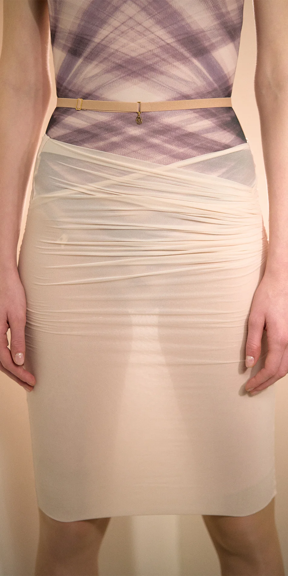 Drawing inspiration from the spontaneous ways dancers repurpose their tights – cutting and reshaping them into sleeves or shrugs, it translates the creativity into an elevated sheer silhouette of pencil skirt.