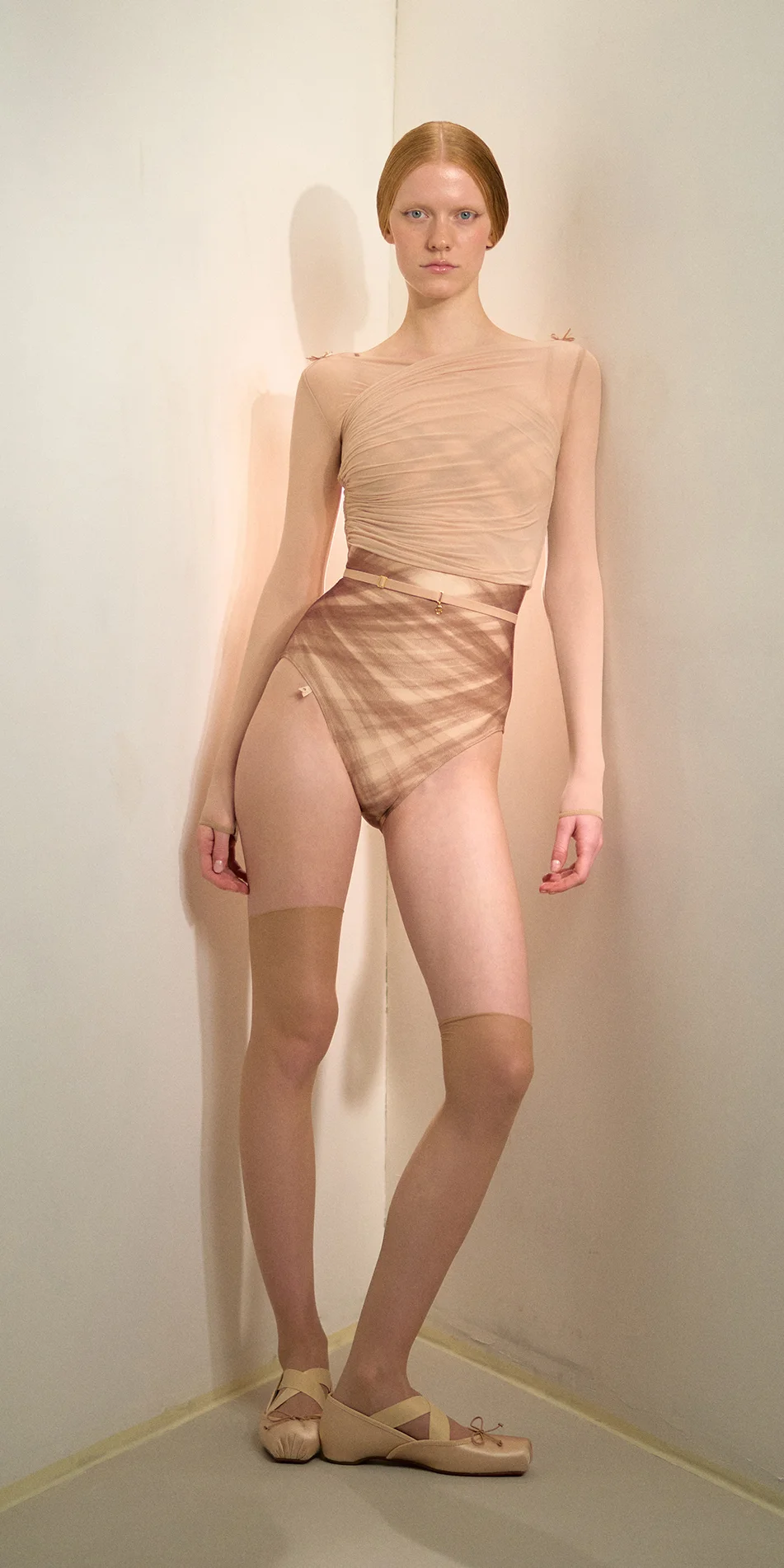 Designed as a performance layer, it reflects the raw creativity of studio life in a refined form. Offered in Edelweiss and Pearl blush.