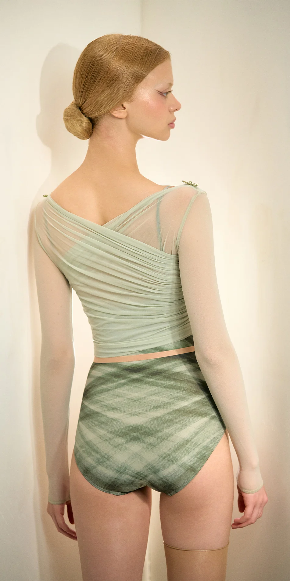 Designed as a performance layer, it reflects the raw creativity of studio life in a refined form. Offered in Edelweiss and Pearl blush.