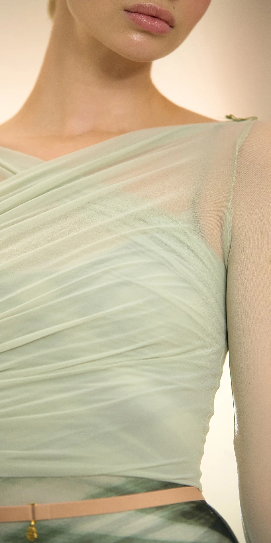 This long sleeves croptop features a sculpted drape with diagonal layers crossing over the chest,
