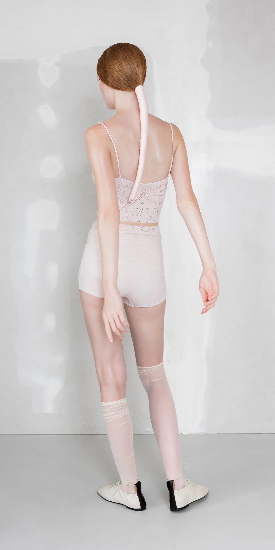 This series draws inspiration from the spontaneous ways dancers repurpose tights – cutting and reshaping them into sleeves or shrugs.