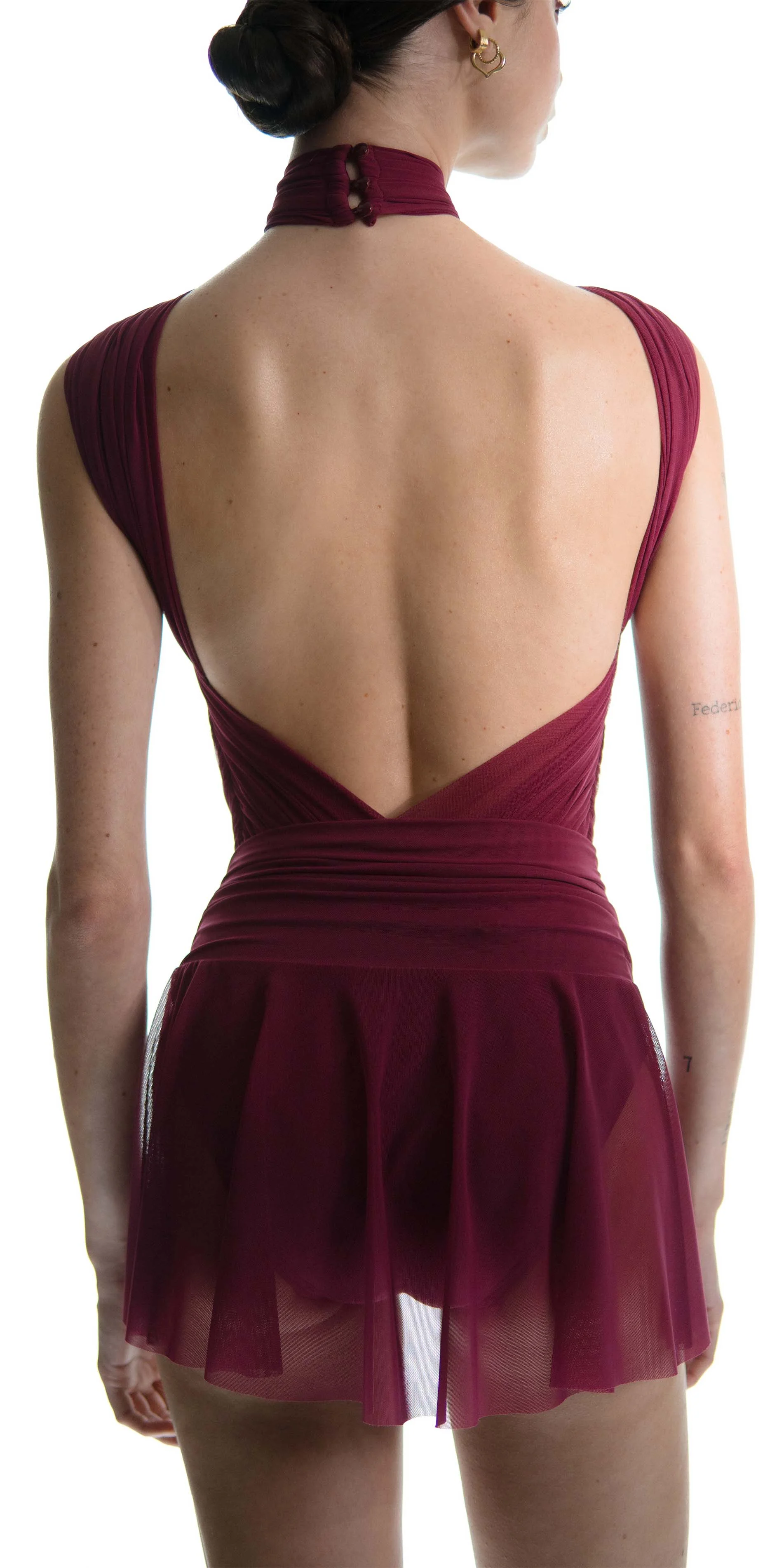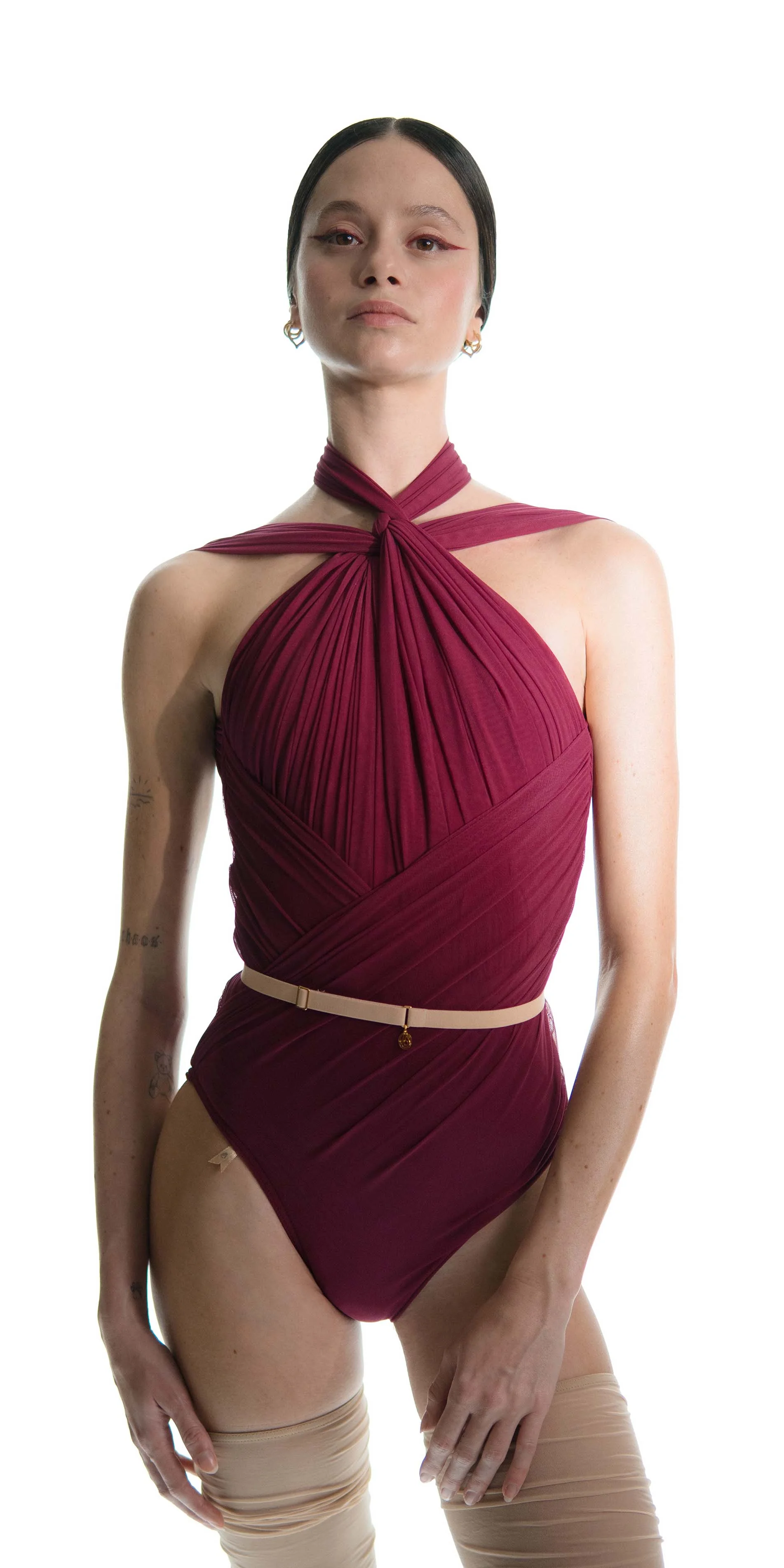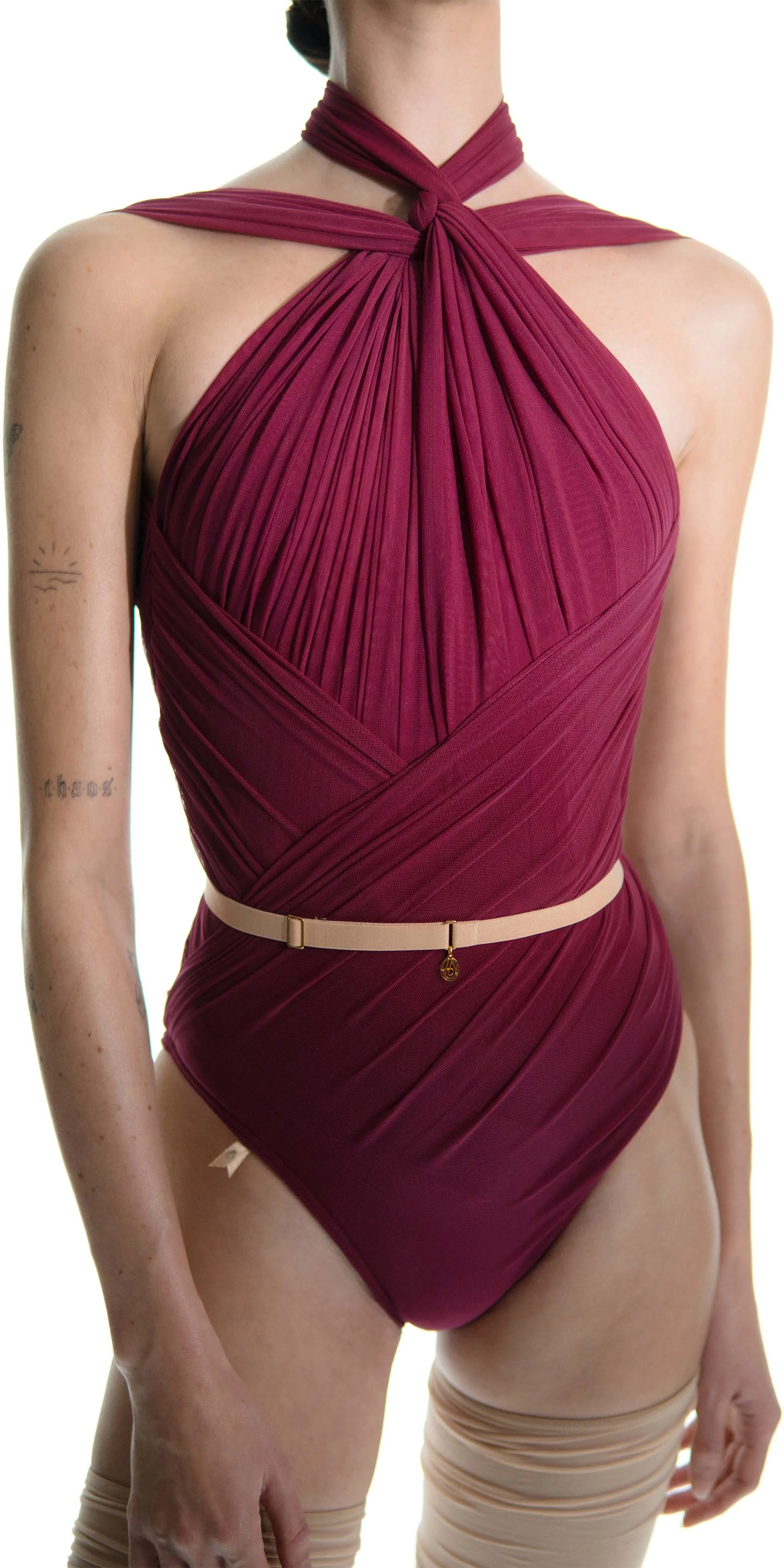 With JAC’s signature draping technique defined by the sophistication and precision, this piece brings couture-level craftsmanship into a fully functional performance garment. Each fold and line is shaped through anatomical draping, tracing the contours of the torso. The knotted halter neckline adds classical elegance, balanced by a clean low U-shaped backline.