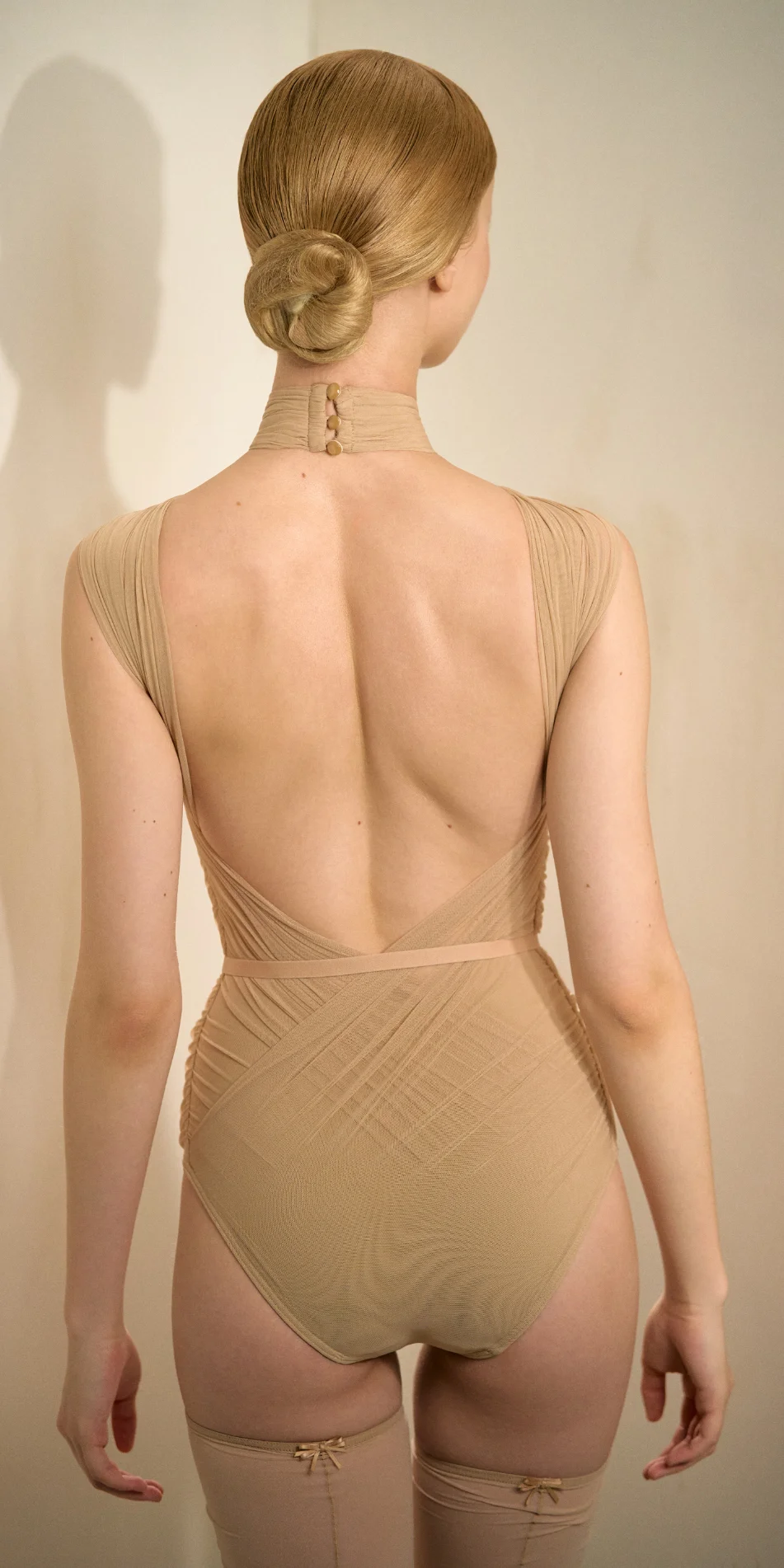 With JAC’s signature draping technique defined by the sophistication and precision, this piece brings couture-level craftsmanship into a fully functional performance garment. Each fold and line is shaped through anatomical draping, tracing the contours of the torso. The knotted halter neckline adds classical elegance, balanced by a clean low U-shaped backline.