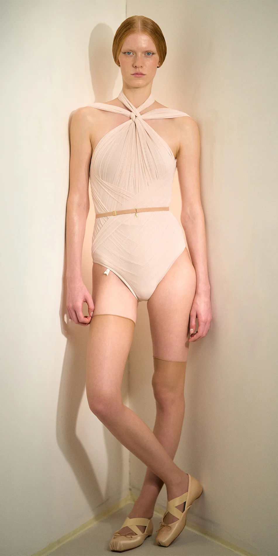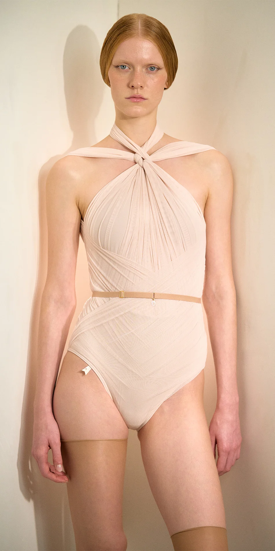 With JAC’s signature draping technique defined by the sophistication and precision, this piece brings couture-level craftsmanship into a fully functional performance garment. Each fold and line is shaped through anatomical draping, tracing the contours of the torso. The knotted halter neckline adds classical elegance, balanced by a clean low U-shaped backline.
