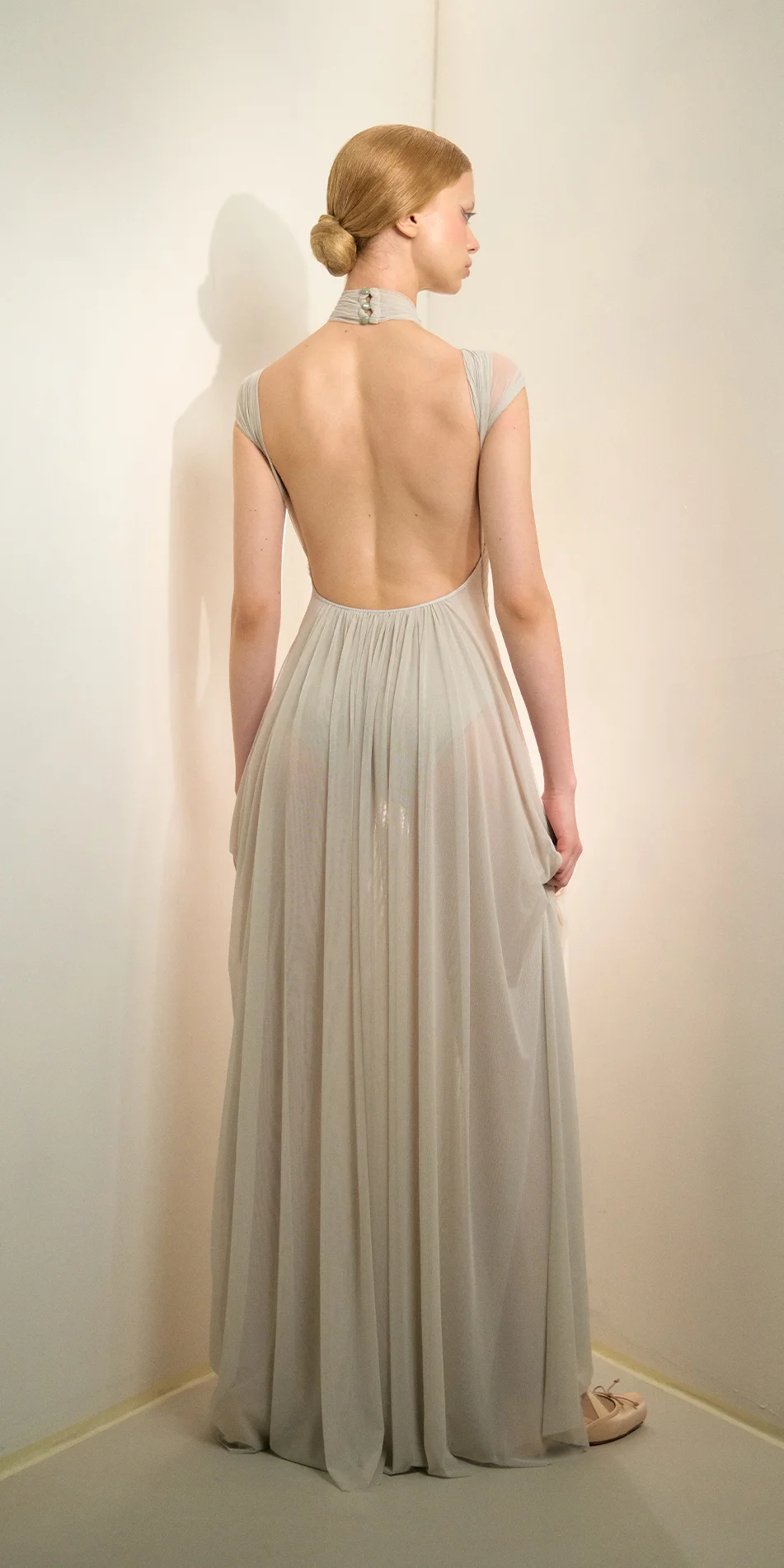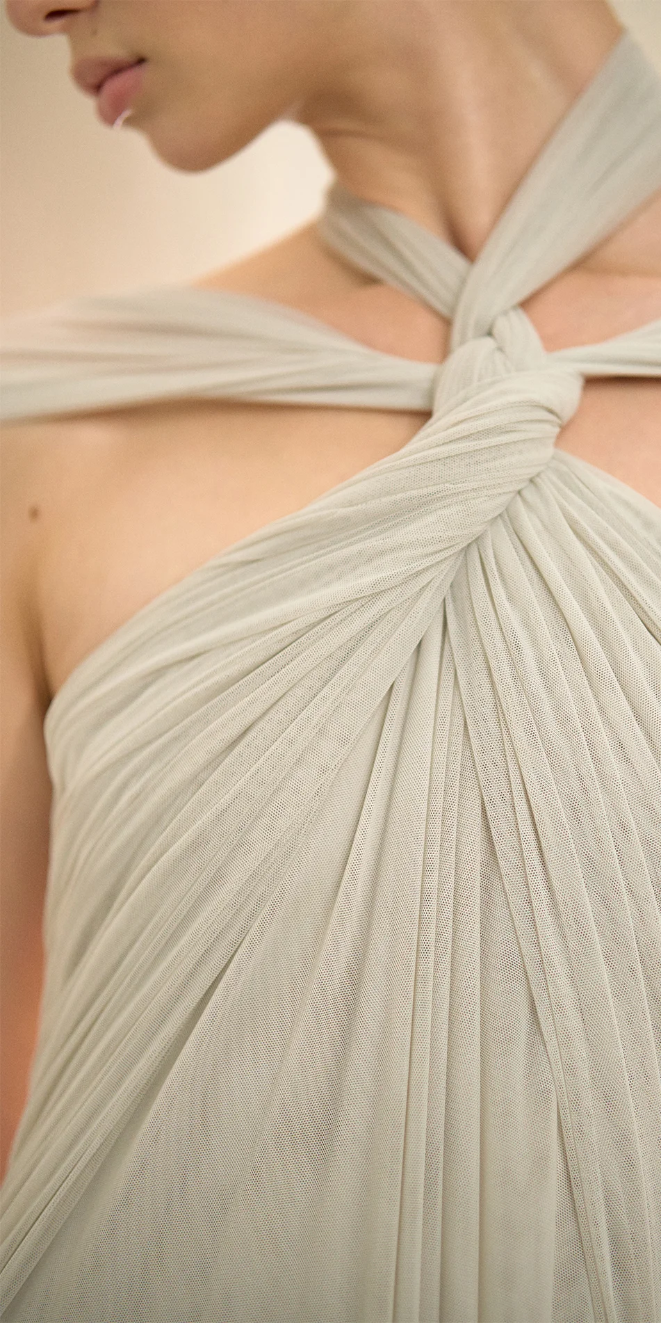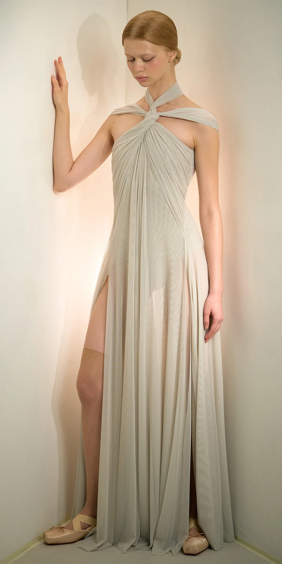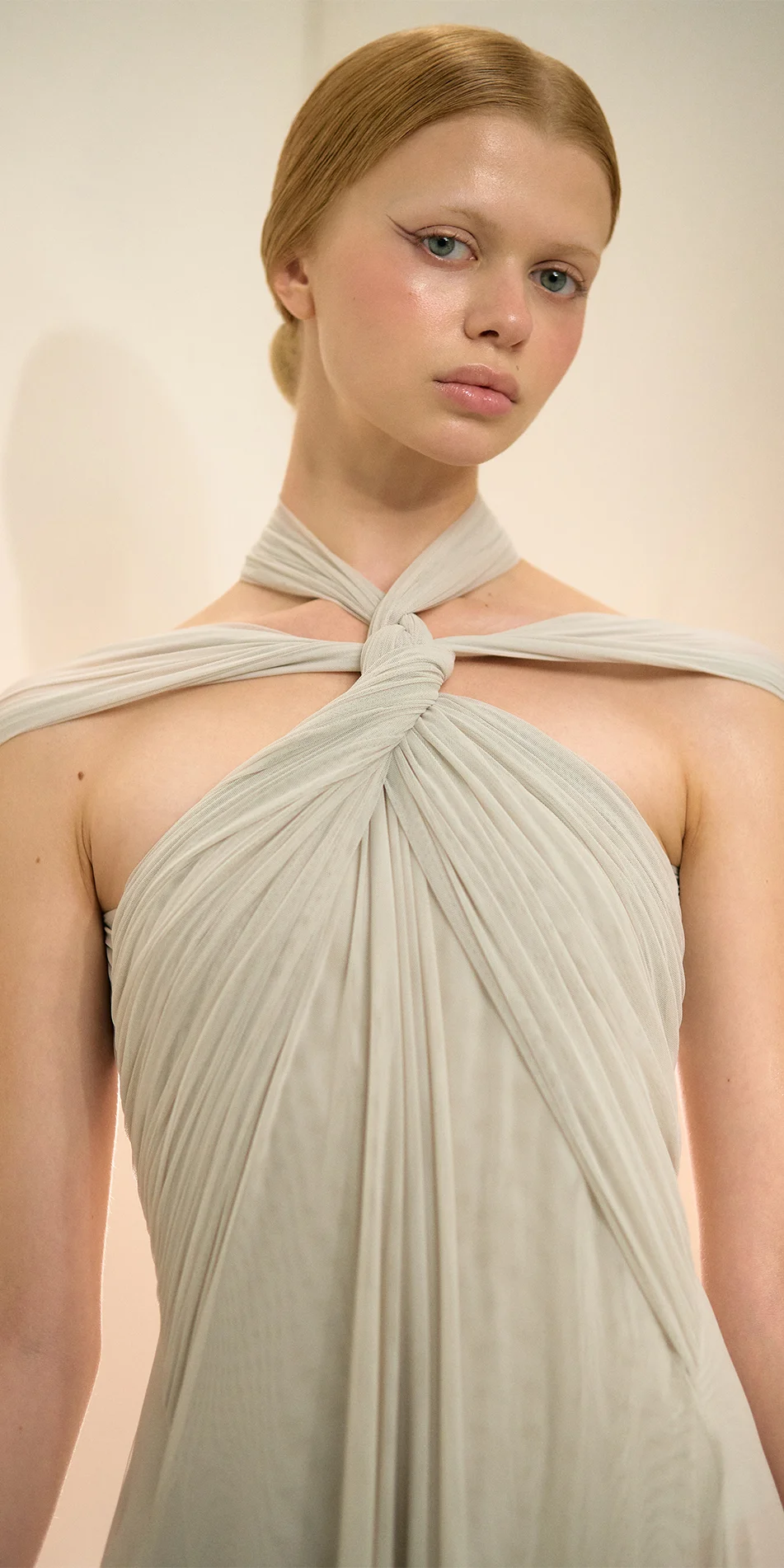 As the very inception of the BodyDress, this piece explores couture draping directly over the leotard to create an elevated occasion dress. A unique knotted halter neckline adds sculptural detail, while the low back brings a sense of classical elegance.
