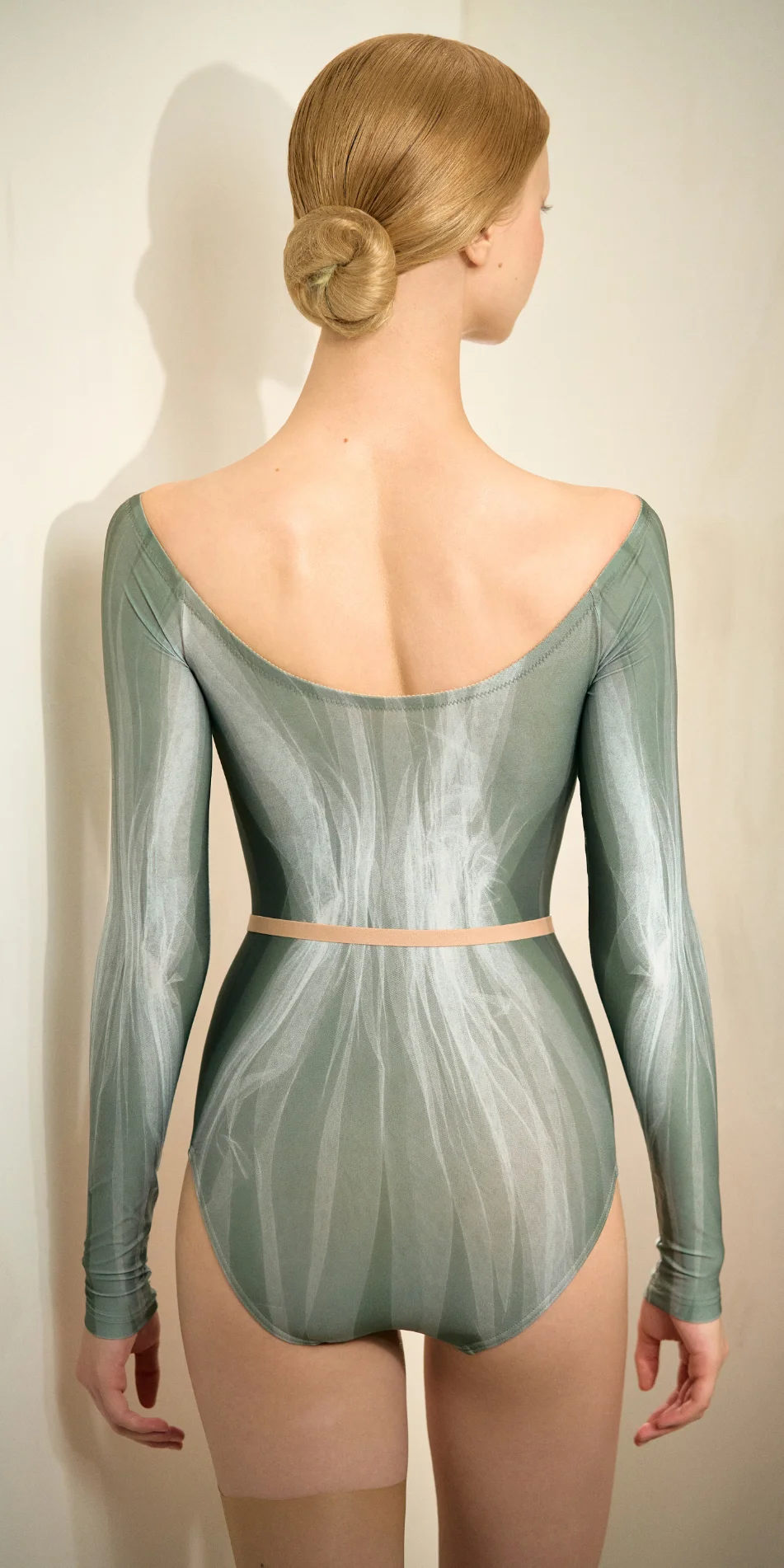 The Hourglass Tulle leotard features a print created by shaping layers of tulle into an hourglass form, then refining it graphically into a body-placed composition that follows the lines of the torso.