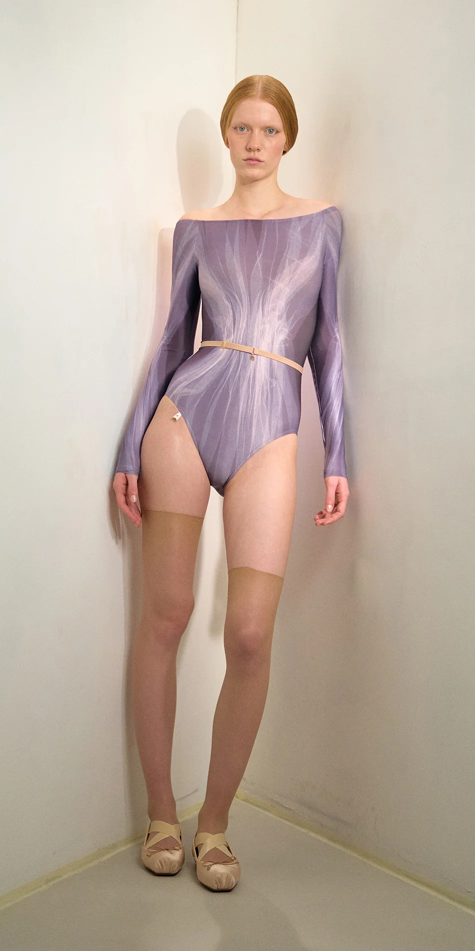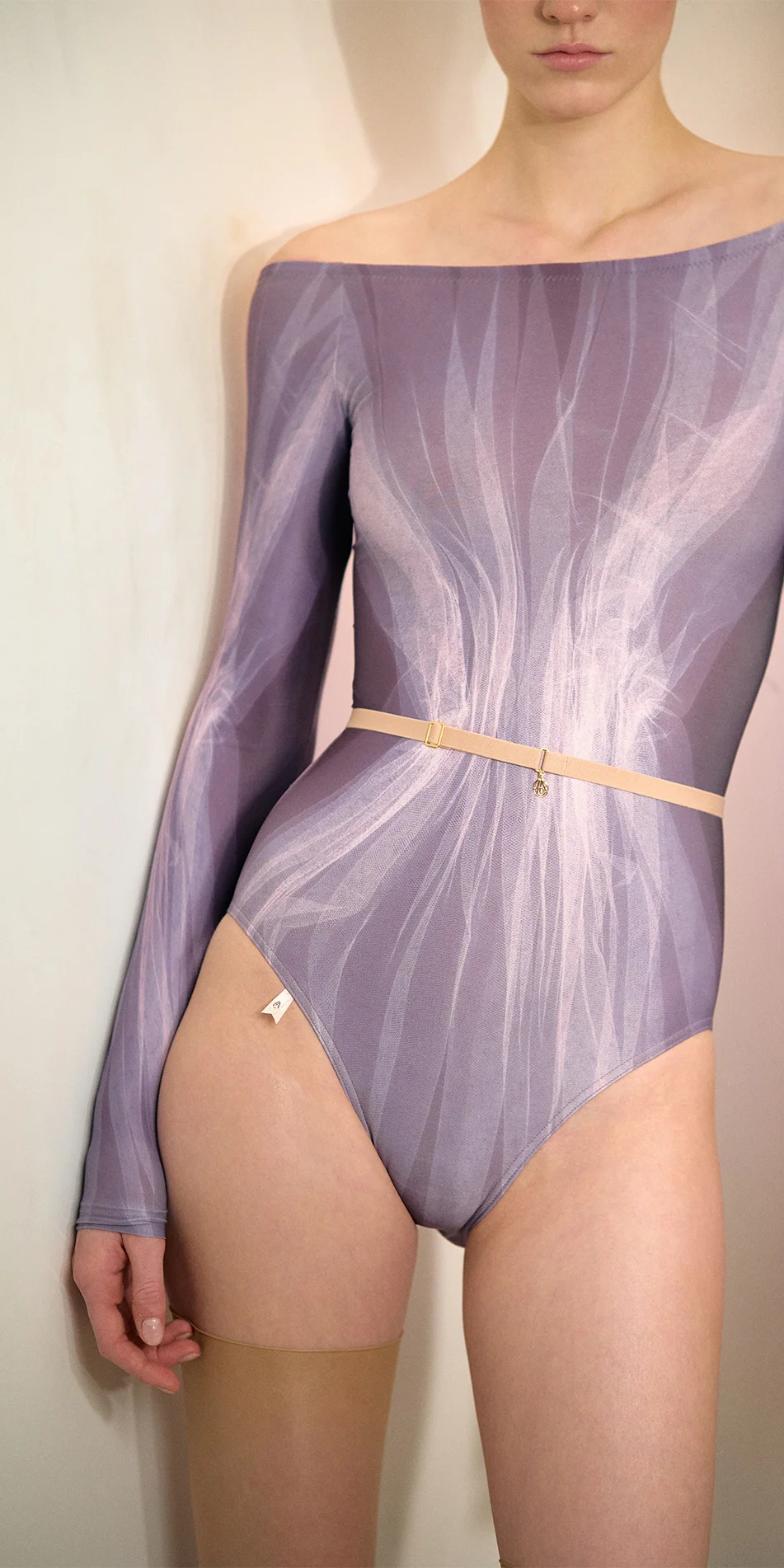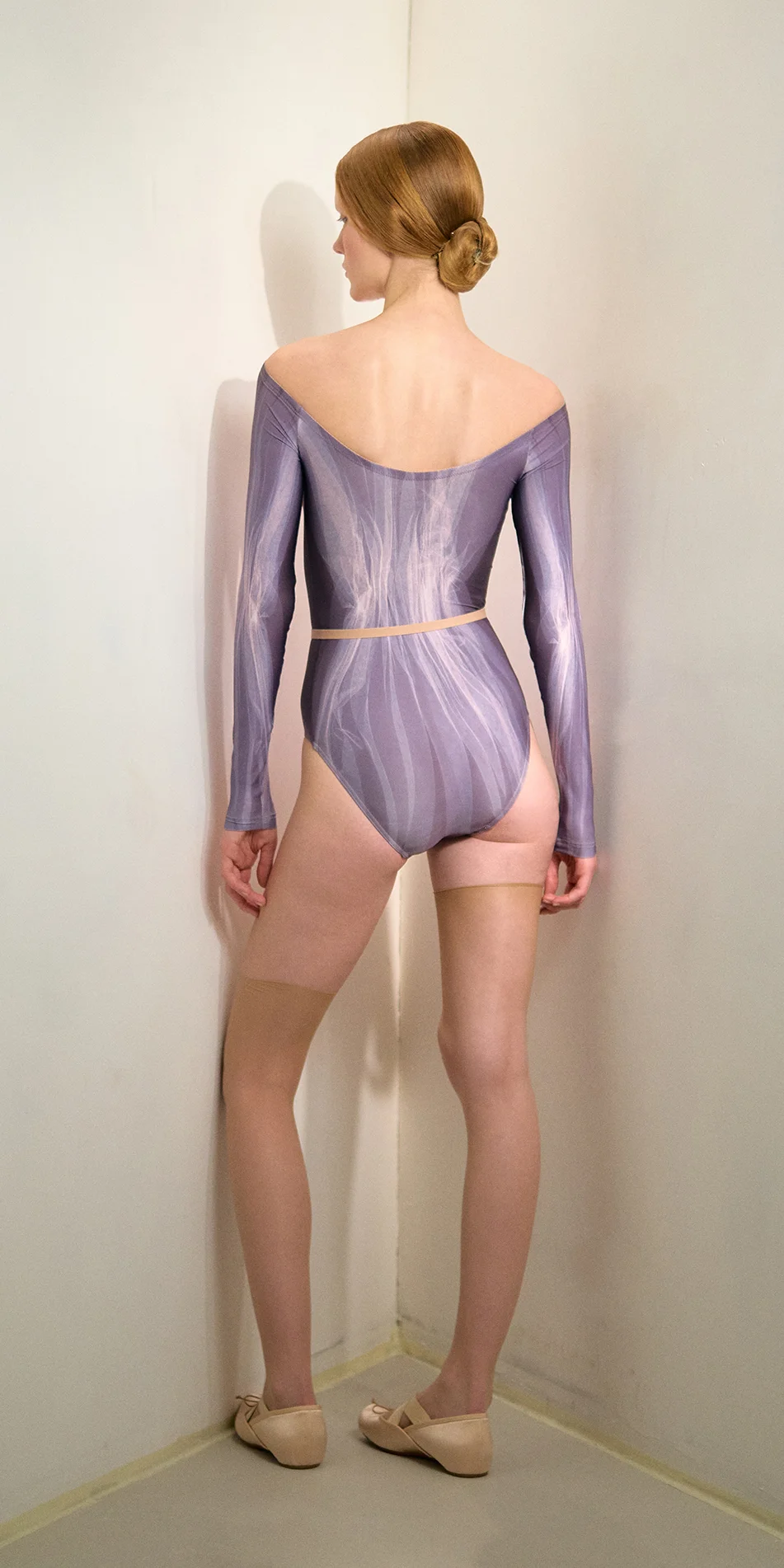 The Hourglass Tulle leotard features a print created by shaping layers of tulle into an hourglass form, then refining it graphically into a body-placed composition that follows the lines of the torso.