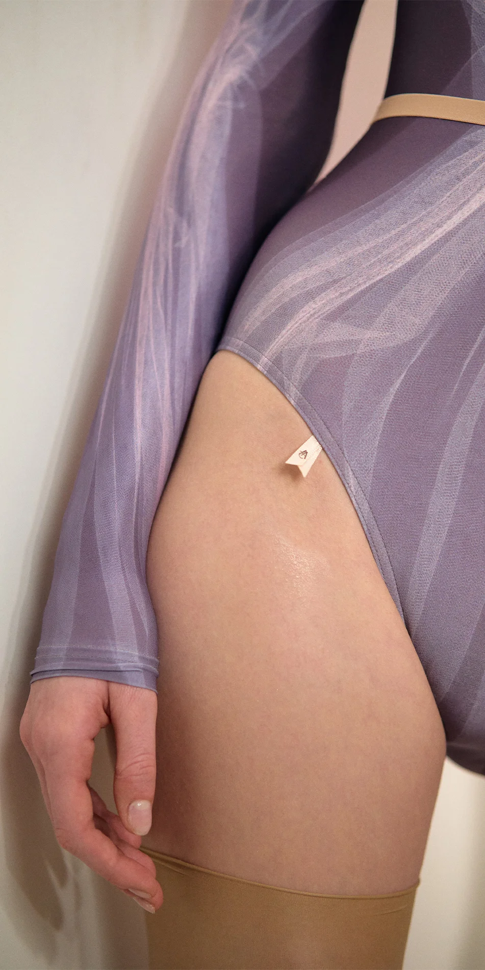 A custom paperboard card helps the leotard hold its shape during delivery. Reflecting the collection’s theme, it’s a small, collectible piece that carries part of the story.