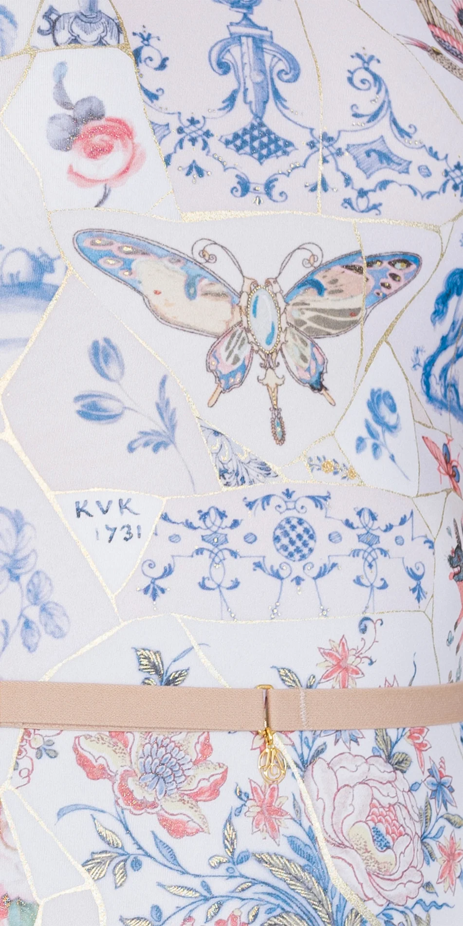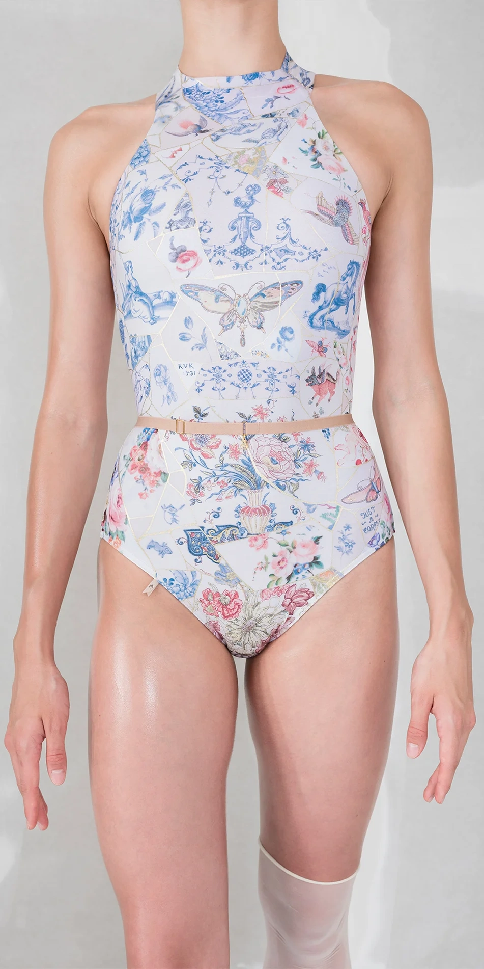 Inspired by the Japanese craft of Kintsugi, the leotard features foil-printed gold stitches that recall the joining of porcelain fragments. Vintage porcelain motifs are collaged and body-placed to form a sculpted composition on the torso.