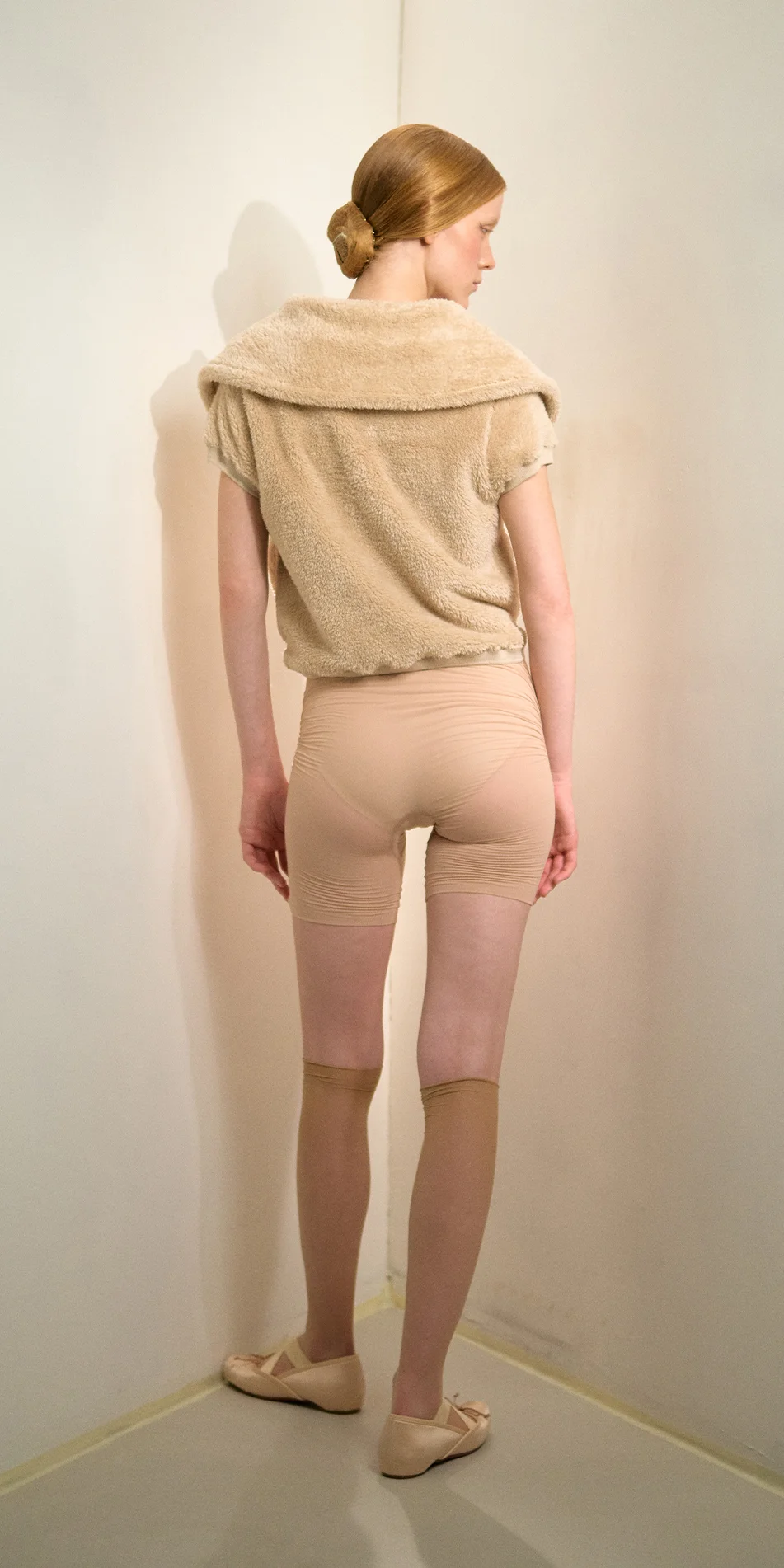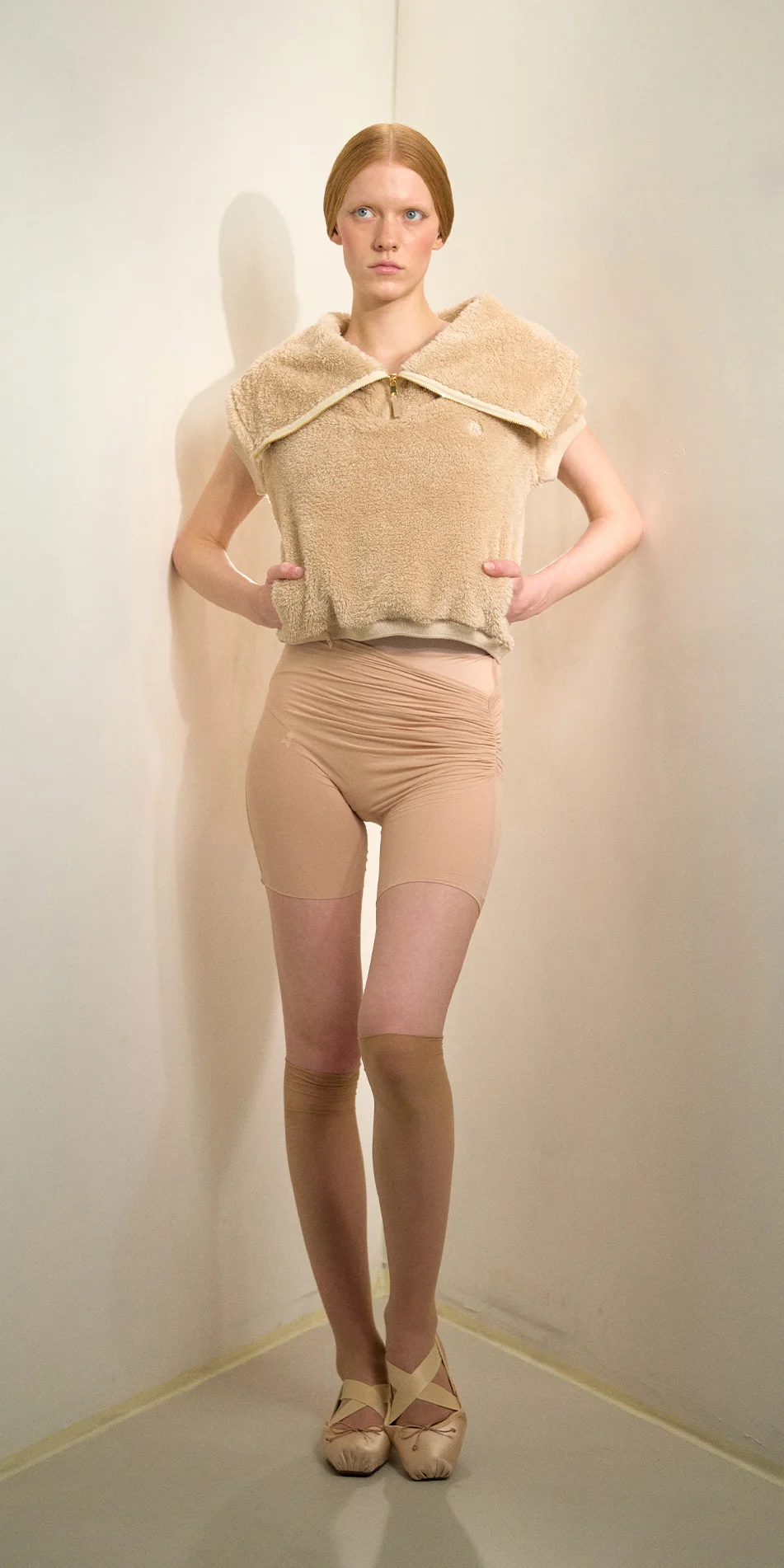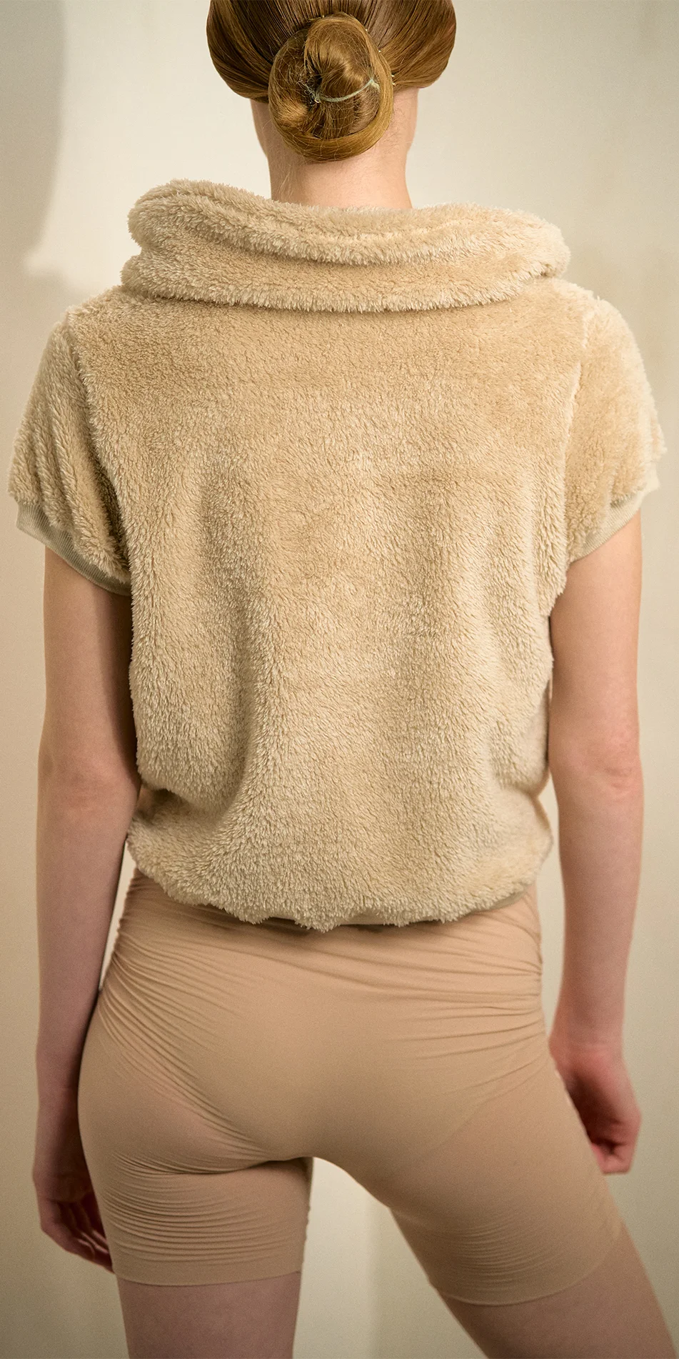 Drawing inspiration from dancers’ essentials, the Plushy Câlin fleece vest is designed for both comfort and style. It features a relaxed fit with a zip-neck that extends into a soft tube neckline, functioning naturally as a neck warmer. Ribbed armhole detailing and side pockets add subtle structure and practicality.