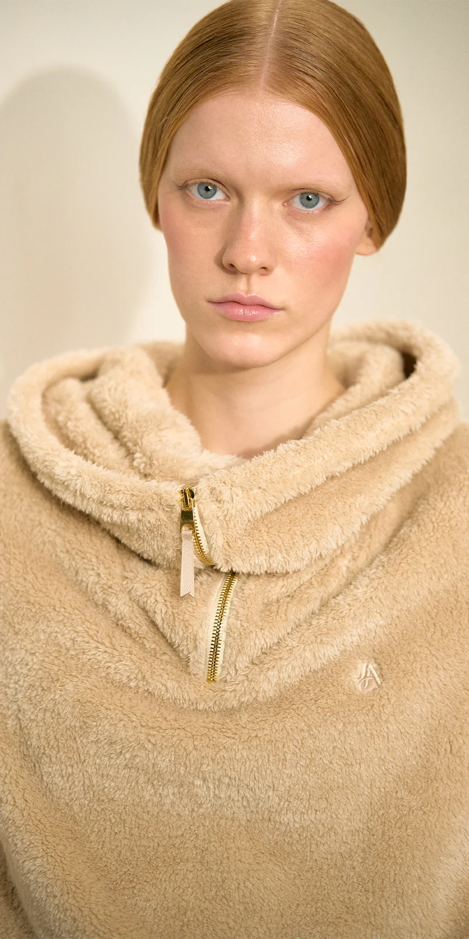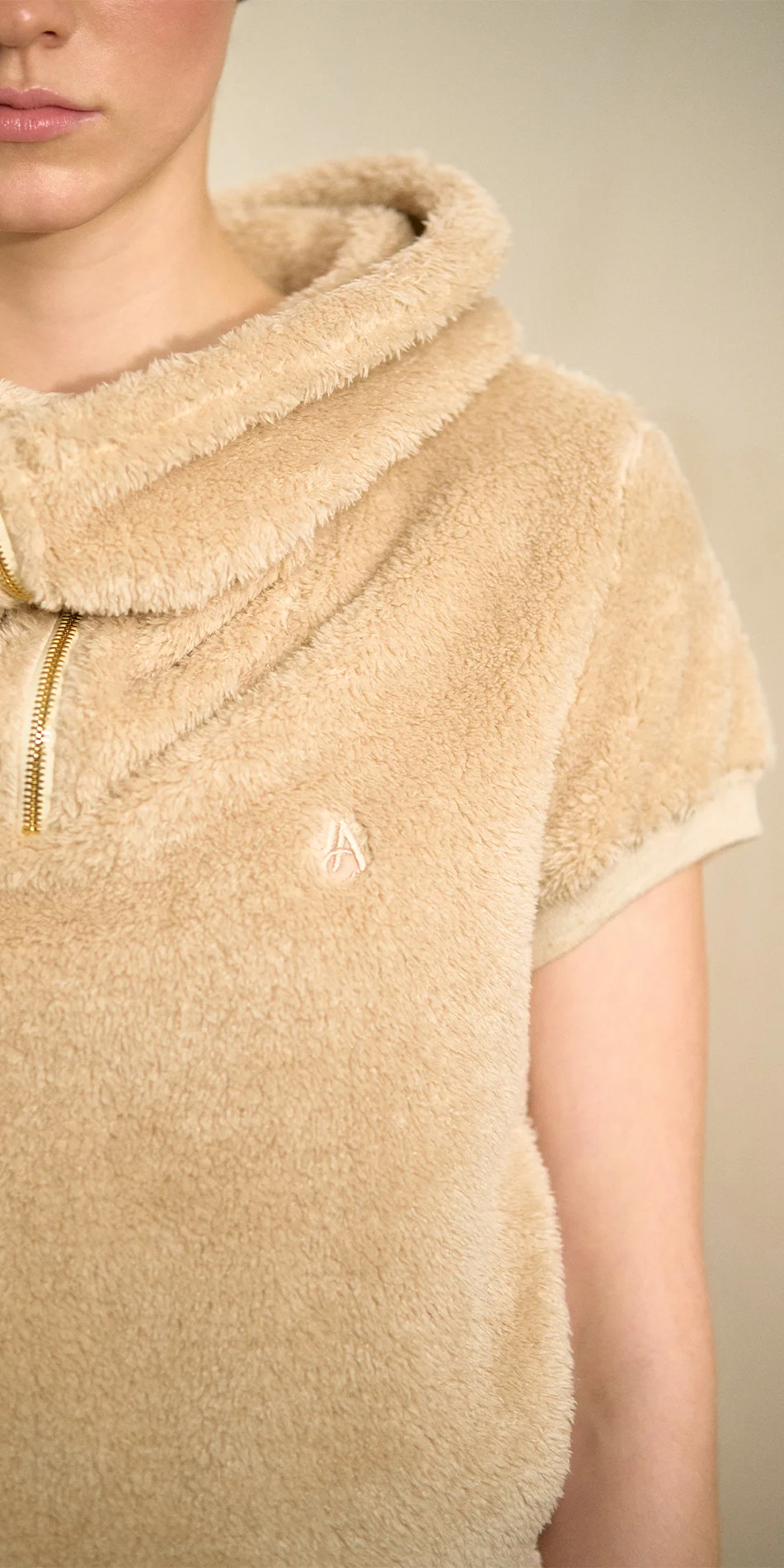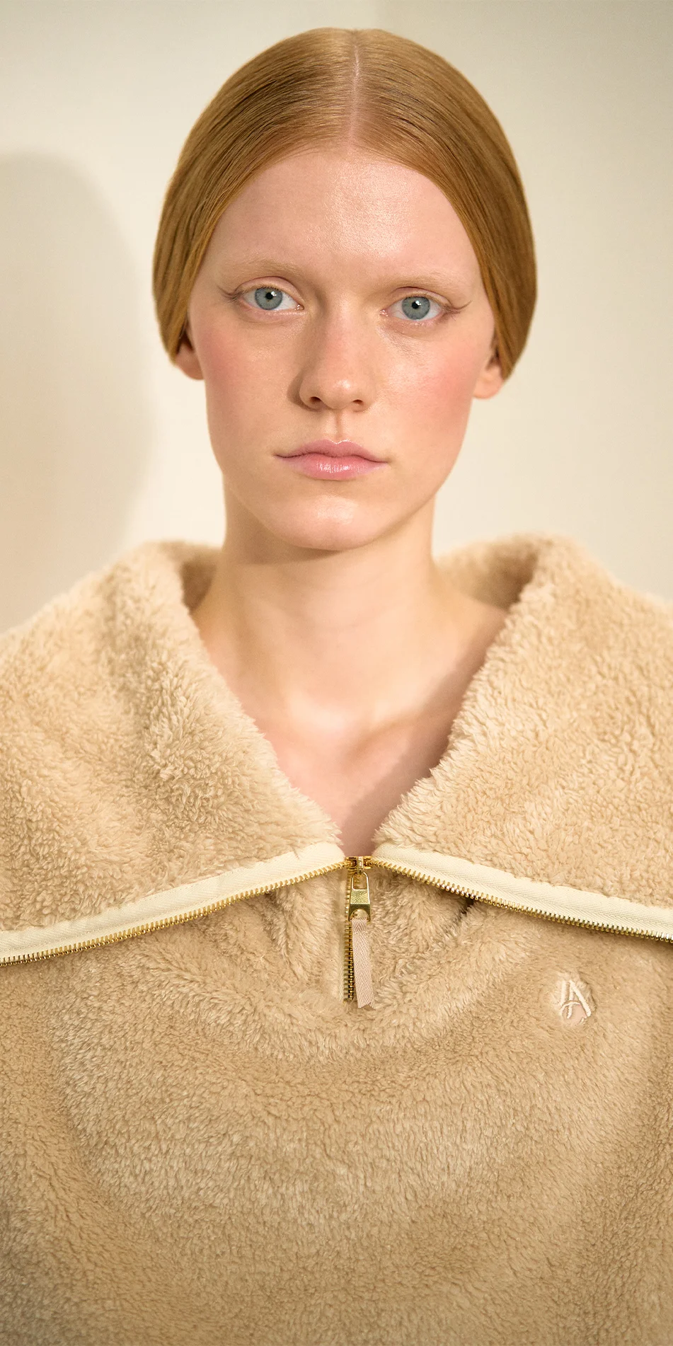 Drawing inspiration from dancers’ essentials, the Plushy Câlin fleece vest is designed for both comfort and style. It features a relaxed fit with a zip-neck that extends into a soft tube neckline, functioning naturally as a neck warmer. Ribbed armhole detailing and side pockets add subtle structure and practicality.