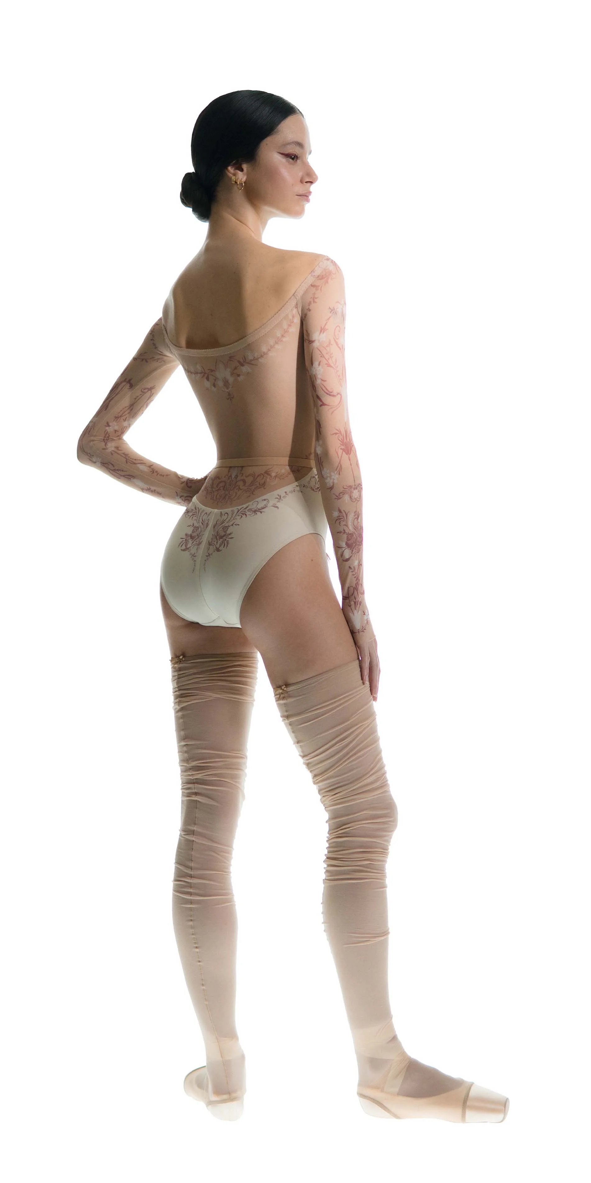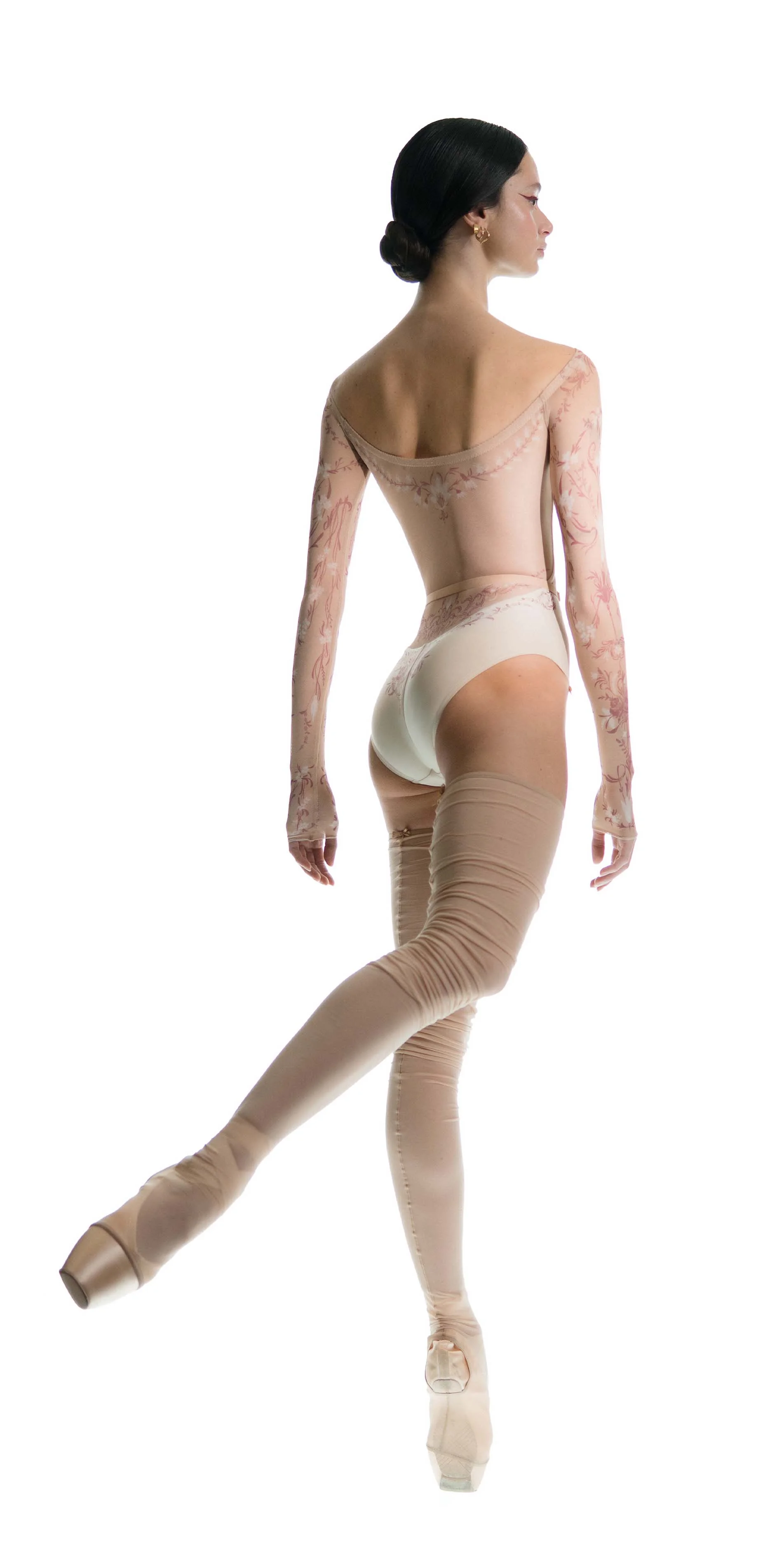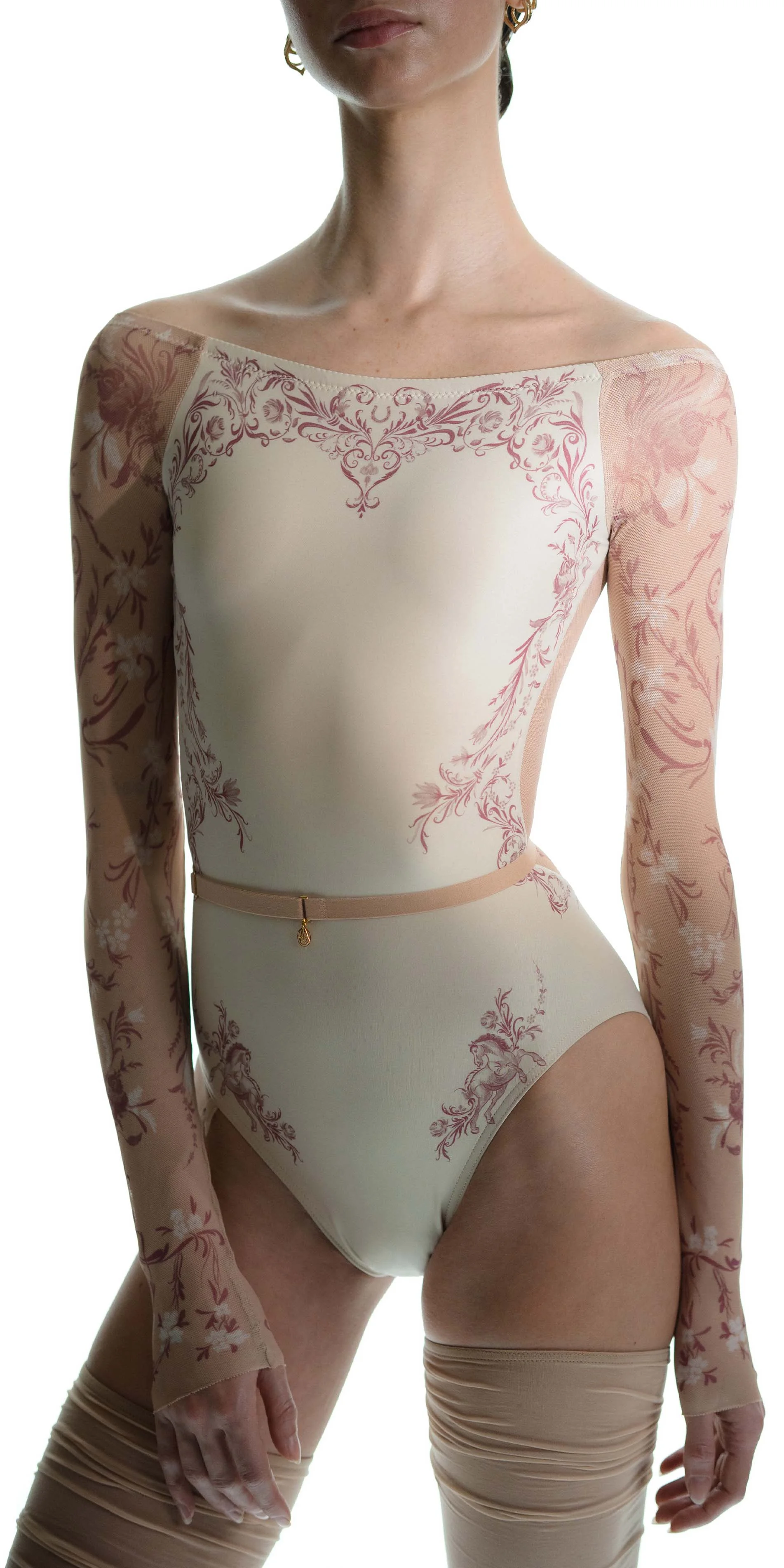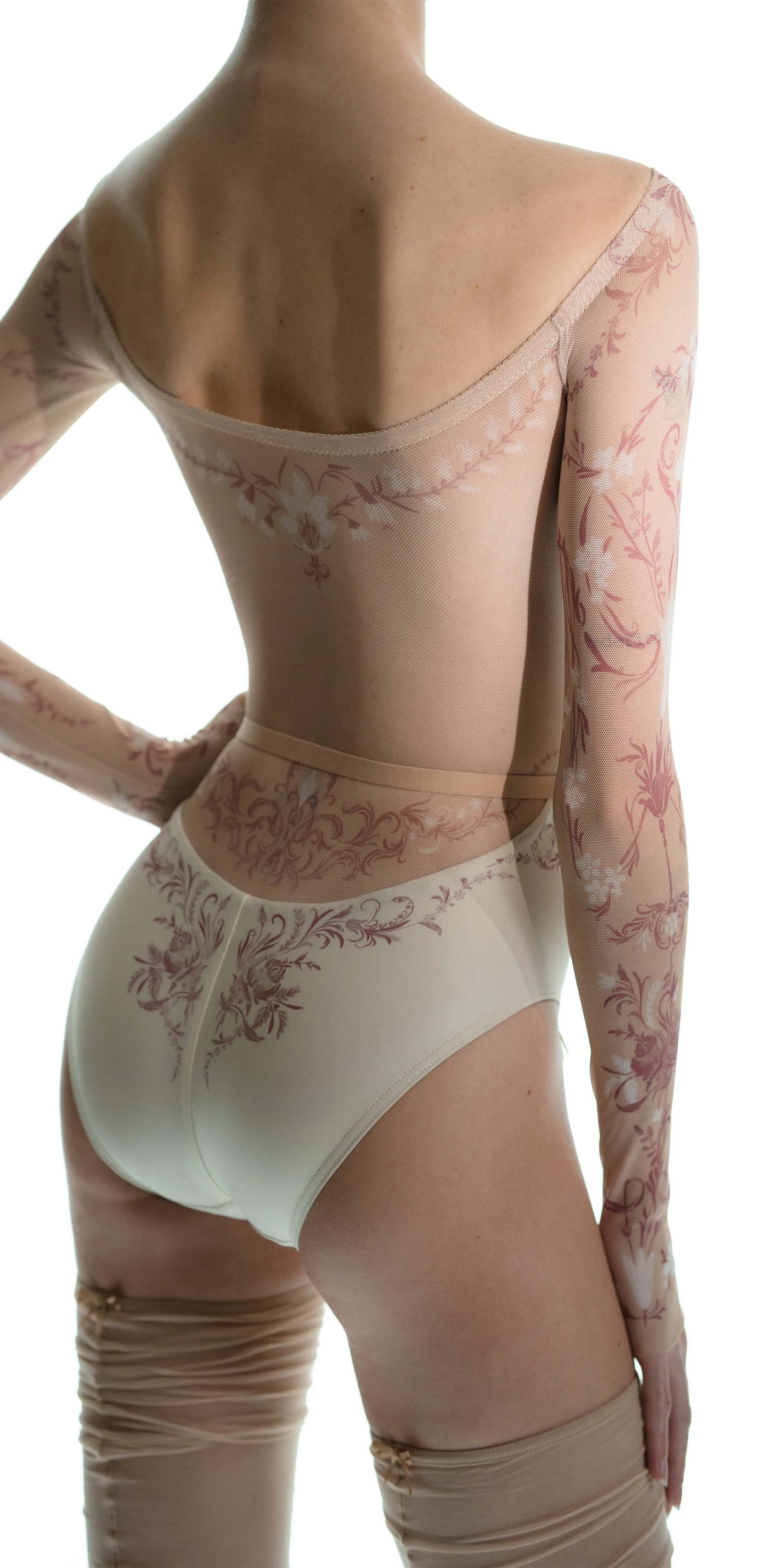 The classic motifs of porcelain are translated onto the body through stretch mesh, allowing the print to flow seamlessly from leotard to skin. By blurring the edges between garment and body, this piece reflects a gentle sophistication of porcelain patterns.