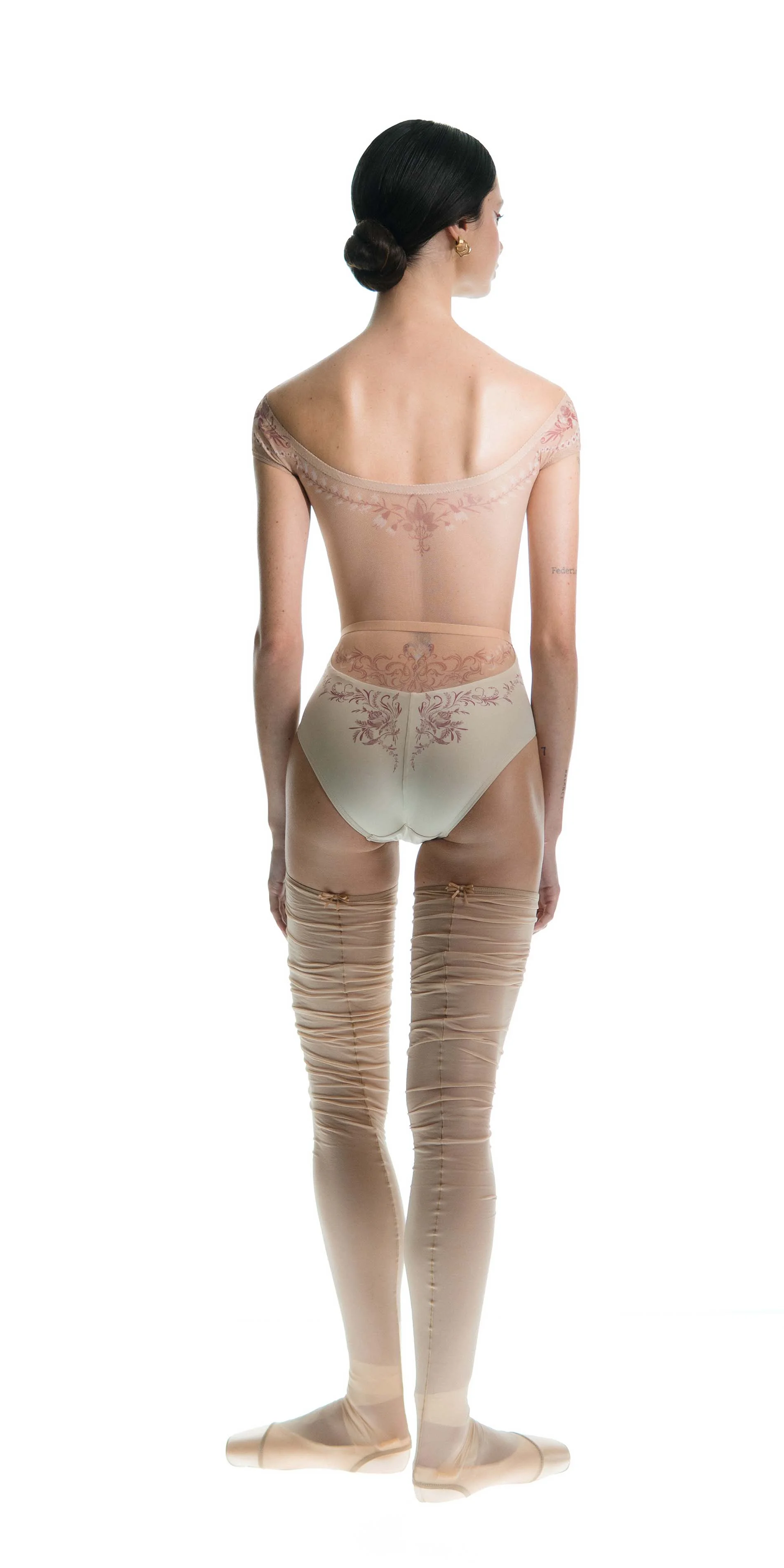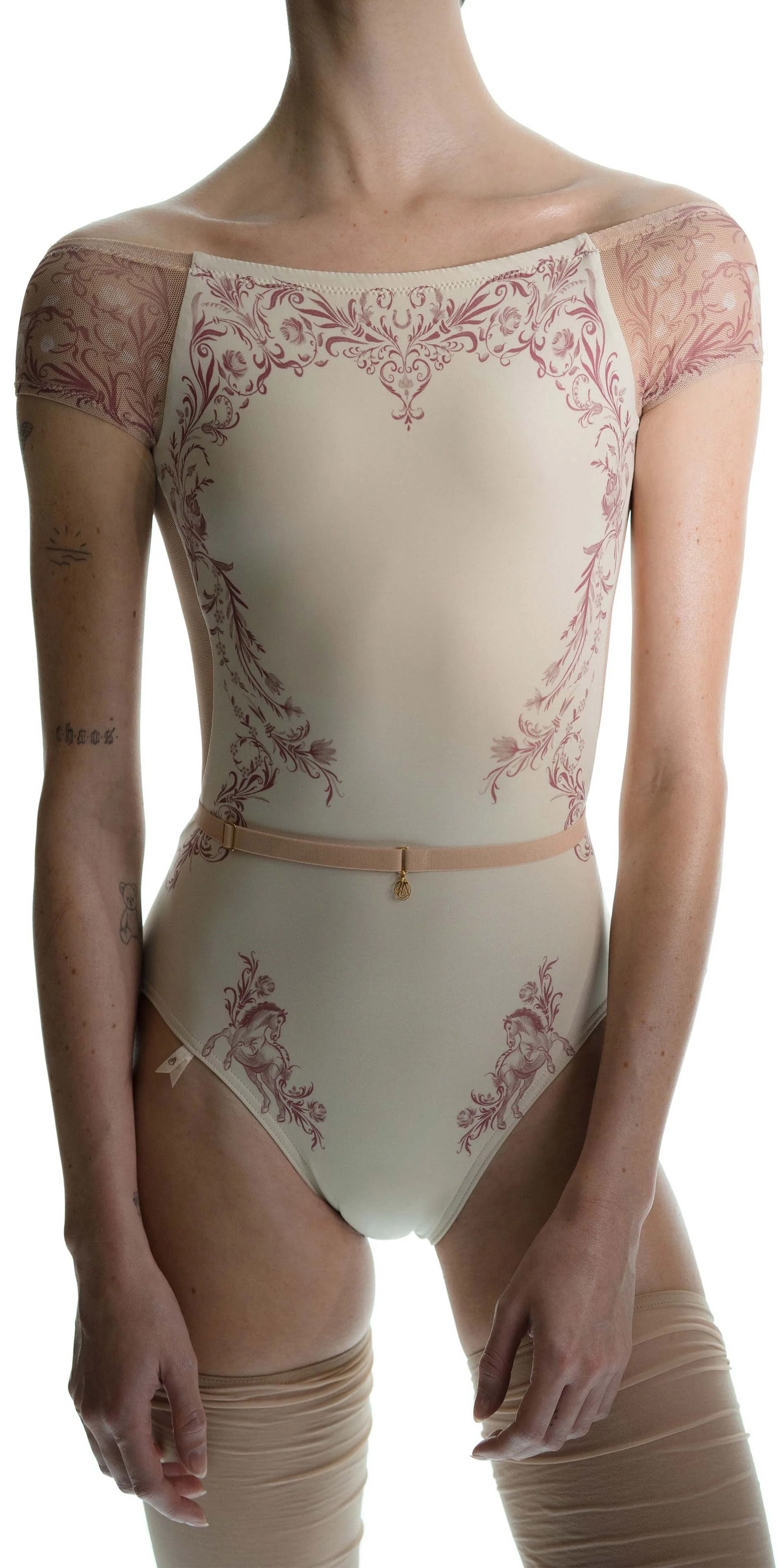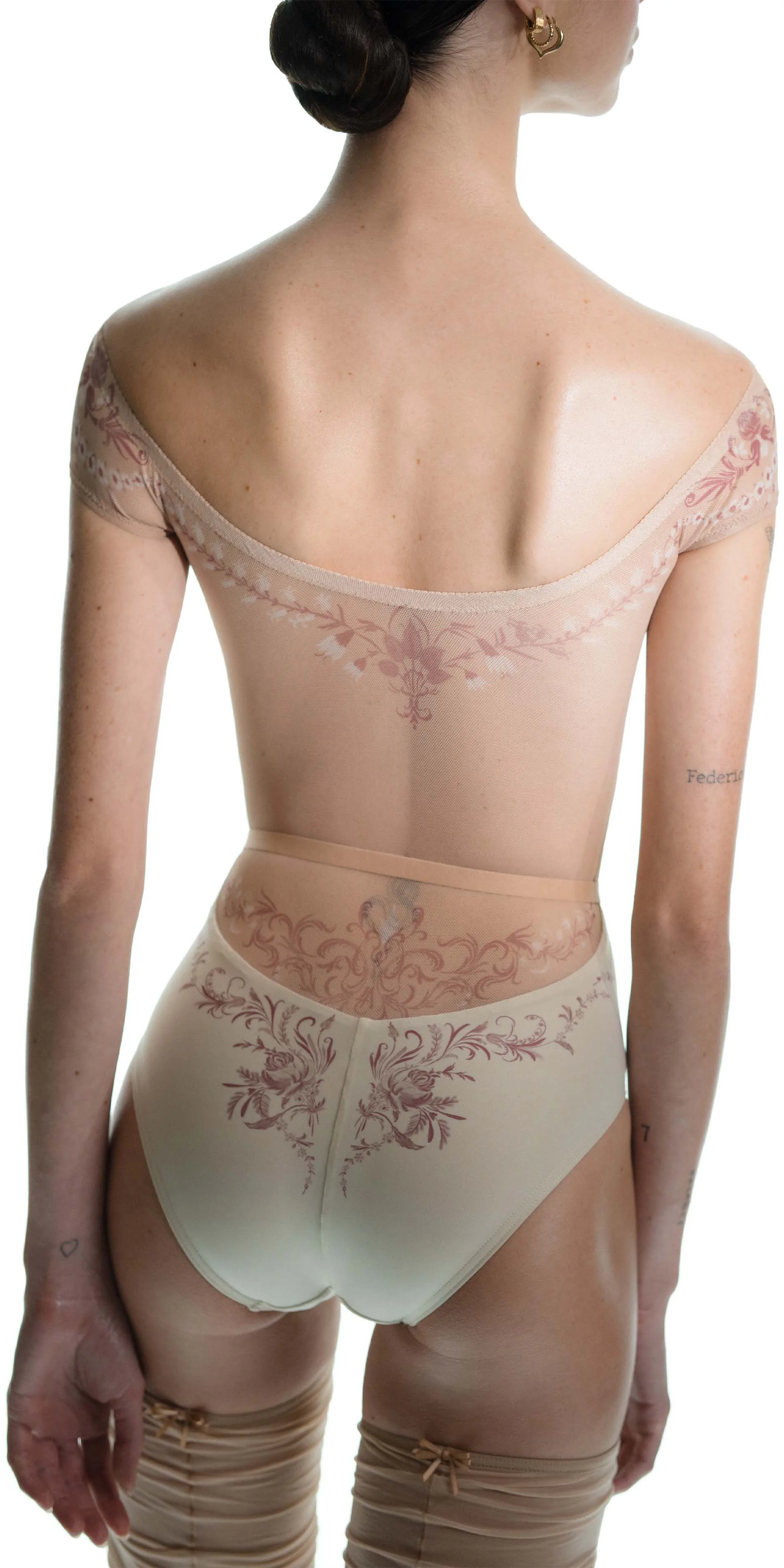 The classic motifs of porcelain are translated onto the body through stretch mesh, allowing the print to flow seamlessly from leotard to skin. By blurring the edges between garment and body, this piece reflects a gentle sophistication of porcelain patterns.