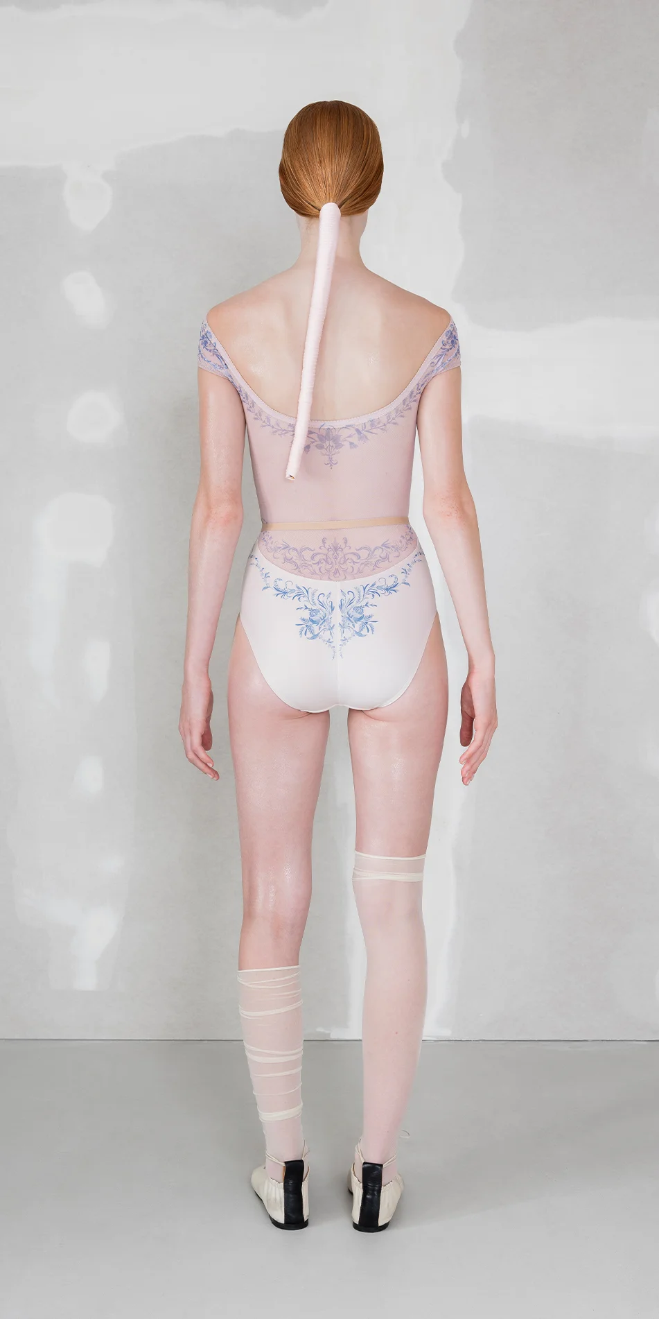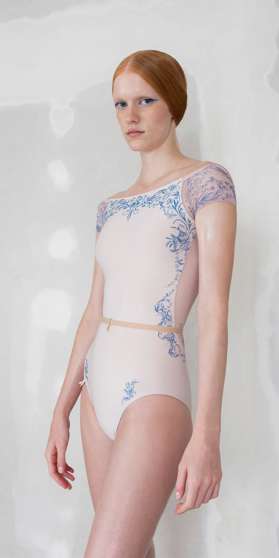 The classic blue motifs of porcelain are translated onto the body through stretch mesh, allowing the print to flow seamlessly from leotard to skin. By blurring the edges between garment and body, this piece reflects a gentle sophistication of porcelain patterns.