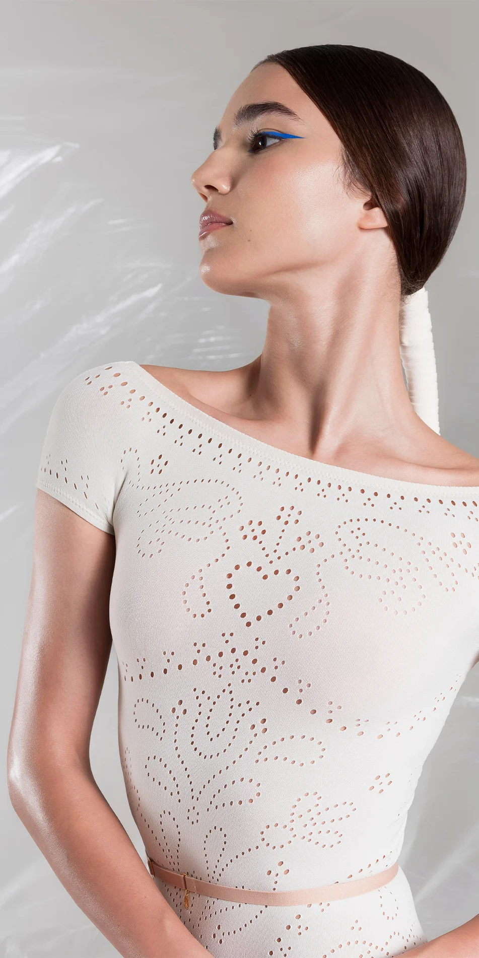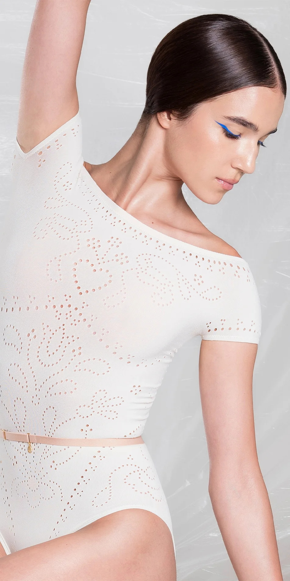 A custom paperboard card helps the leotard hold its shape during delivery. Reflecting the collection’s theme, it’s a small, collectible piece that carries part of the story.