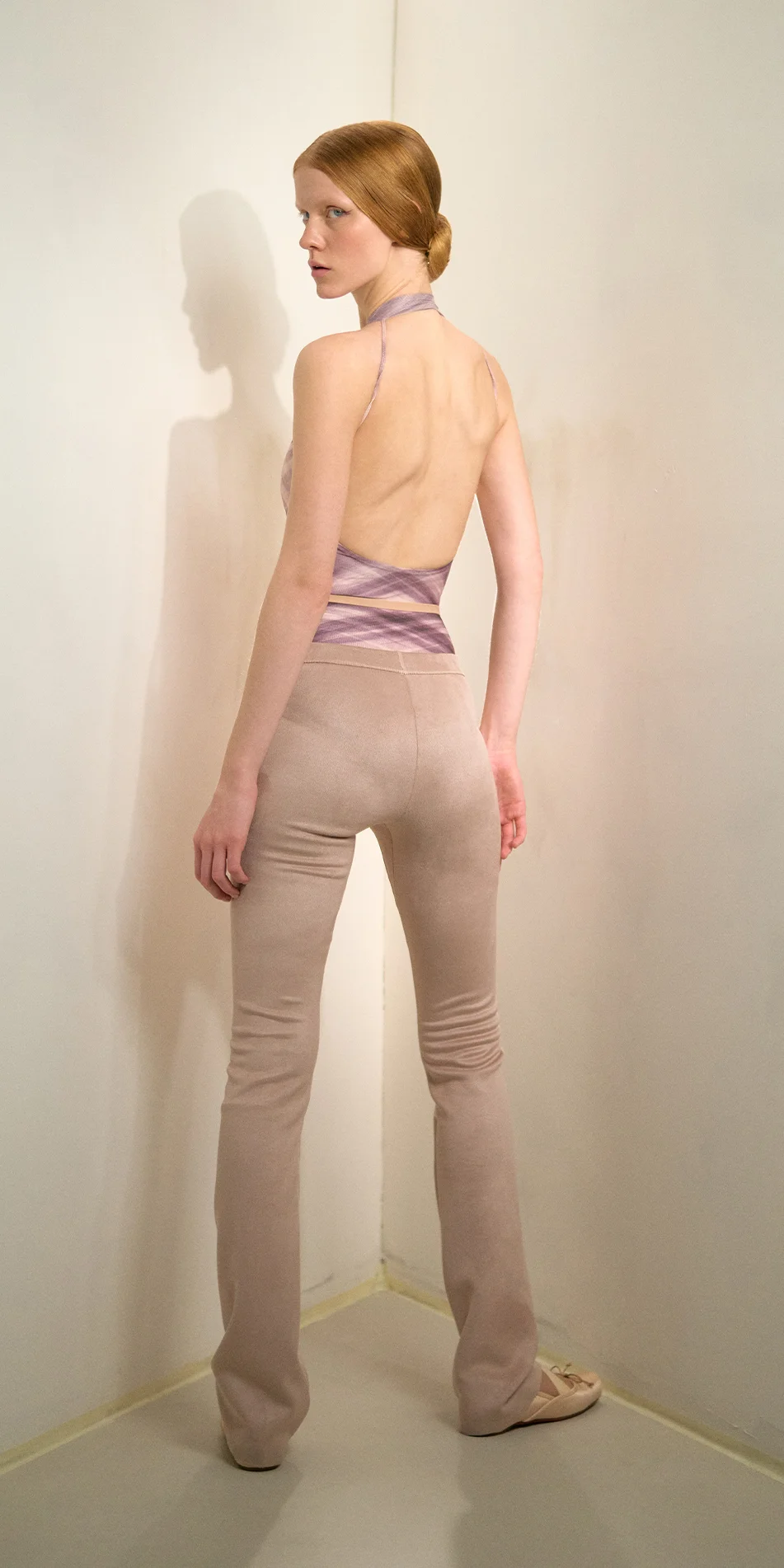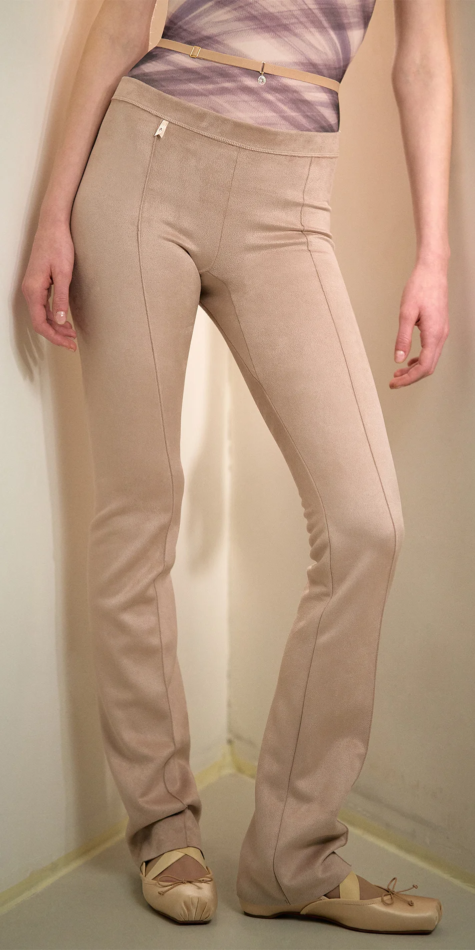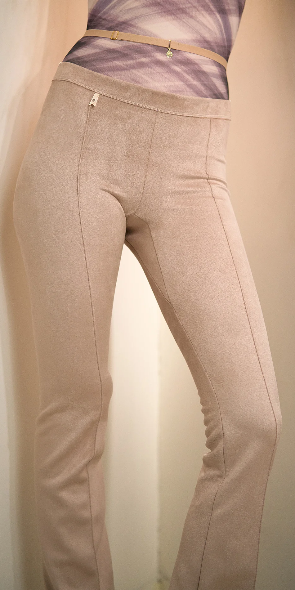 The outer layer is crafted from a peach-touch faux suede for a soft, matte look, while the inside is lined with jersey for a smooth feel against the skin. An integrated gusset at the crotch provides ease in movement and prevents tension, ensuring a comfortable fit throughout the day.
