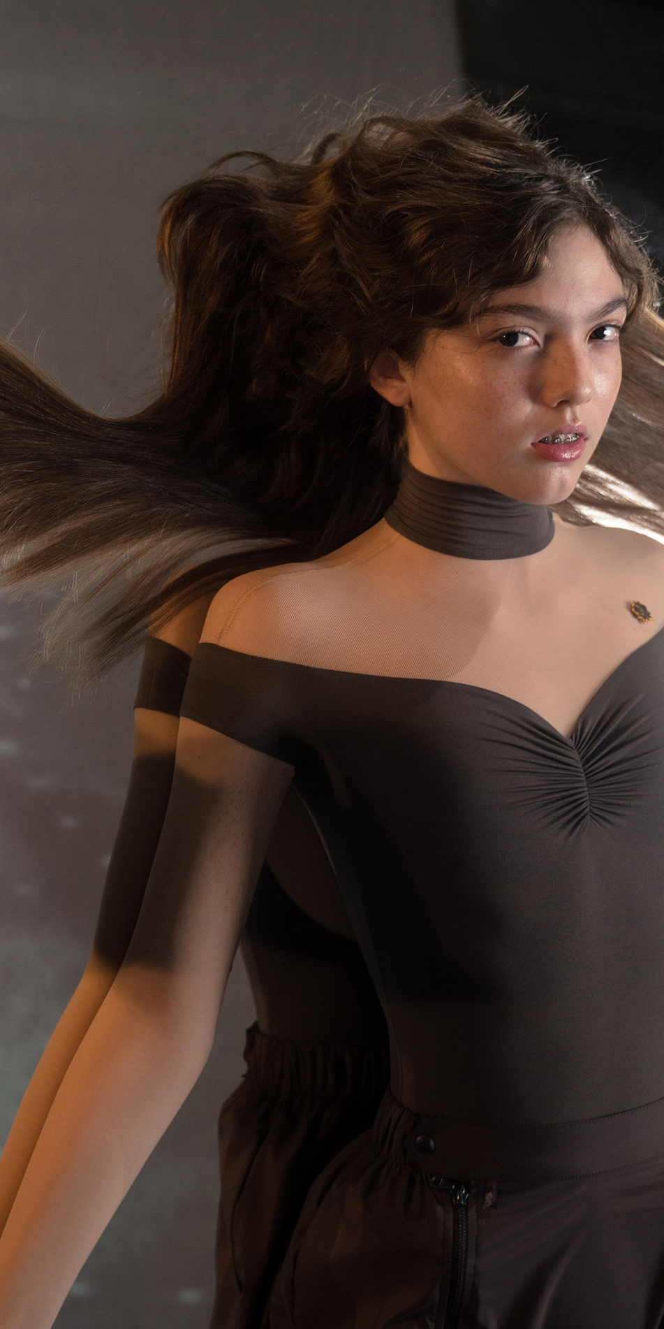 SWEETHEART – off shoulder mesh décolleté leotard with sleeves – chocolate