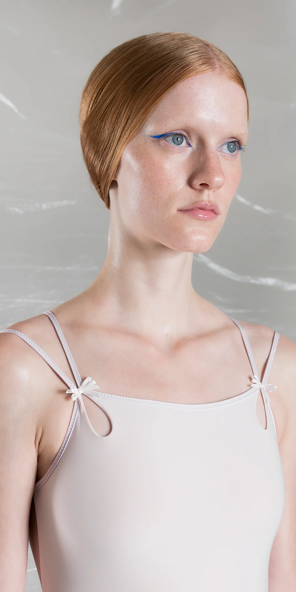 Designed for both studio and everyday settings. Wear it to studio practice and rehearsal, or layer with jeans or skirts as part of a daily wardrobe. Offered in shades of Edelweiss and Pearl blush.