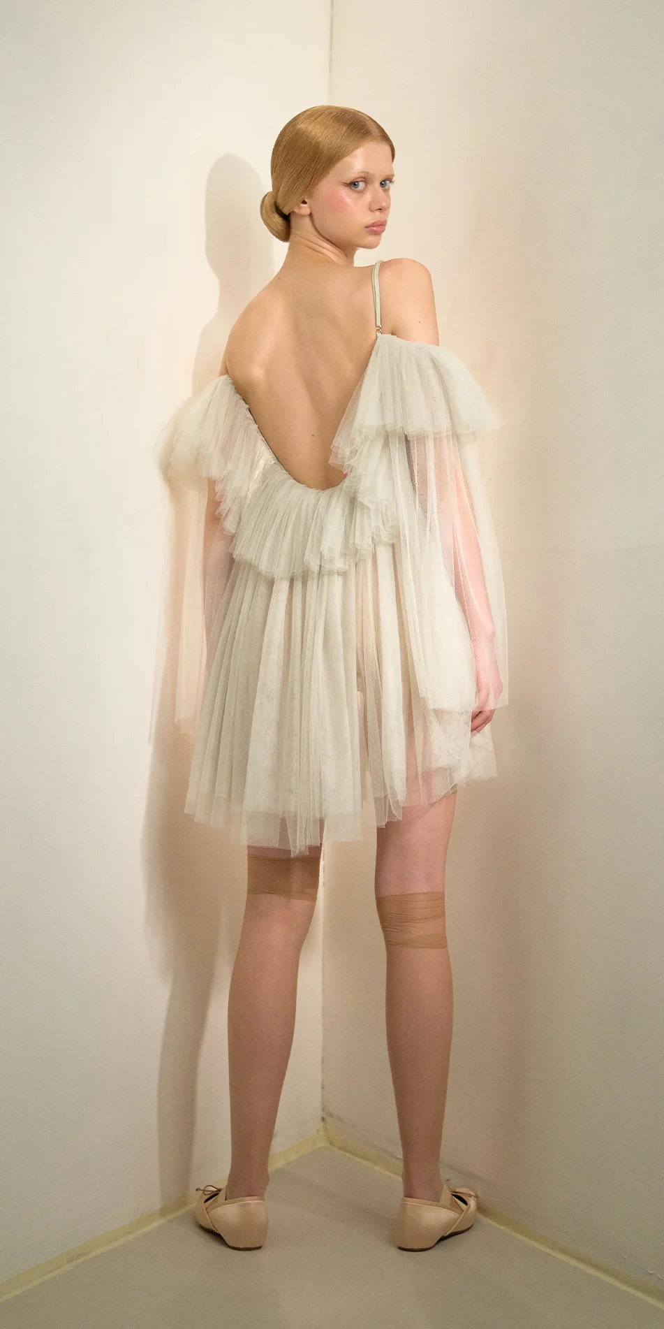Inspired by the construction of classic tutus, the design reinterprets layered draping into an airy, voluminous babydoll silhouette. The outer layer is crafted from lightweight Italian tulle, creating a soft, cloud-like shape with dynamic movement and effortless lightness.
