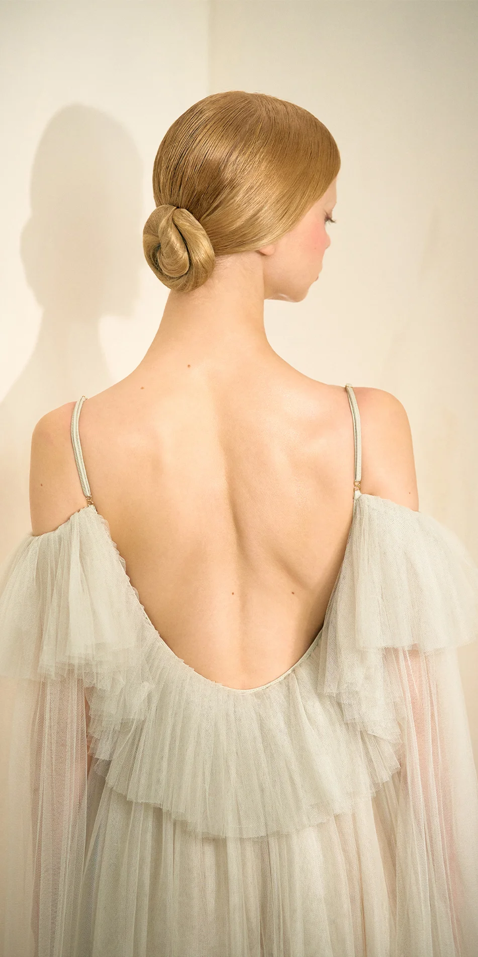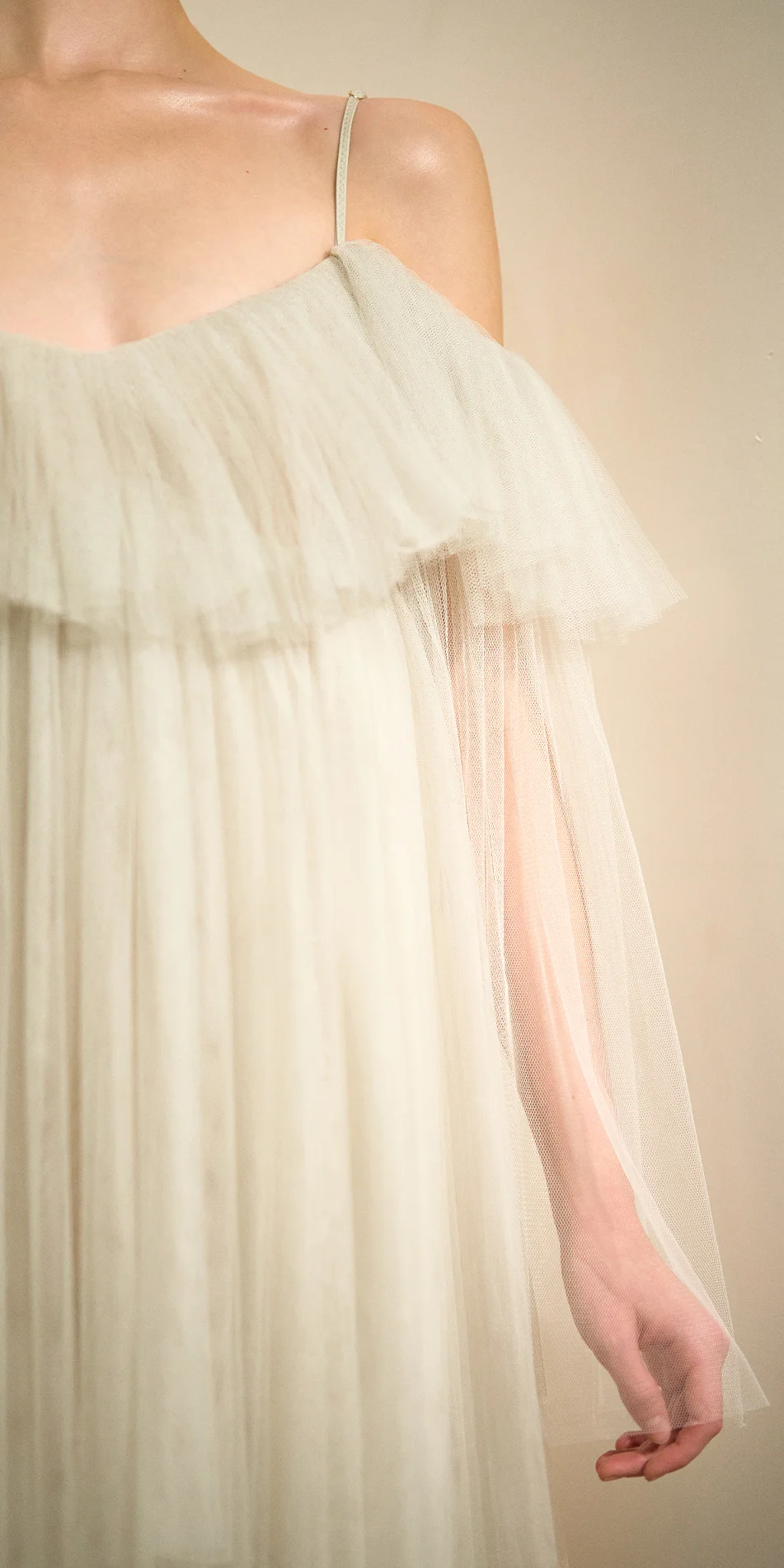 This delicate yet resilient tulle may snag. If a thread is pulled, gently stretch the fabric in all directions to help it return to its original shape. The angel sleeves are designed for versatile styling — wear them pulled up on the arm or let them drape freely underneath. Handle and store with care to preserve the dress’s airy structure.