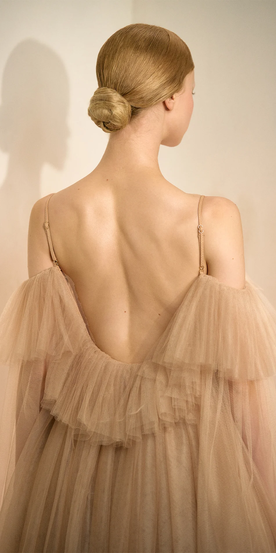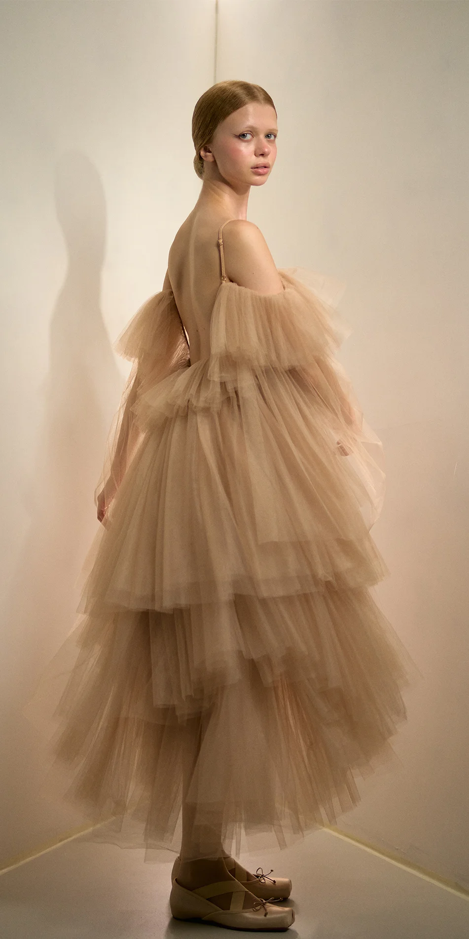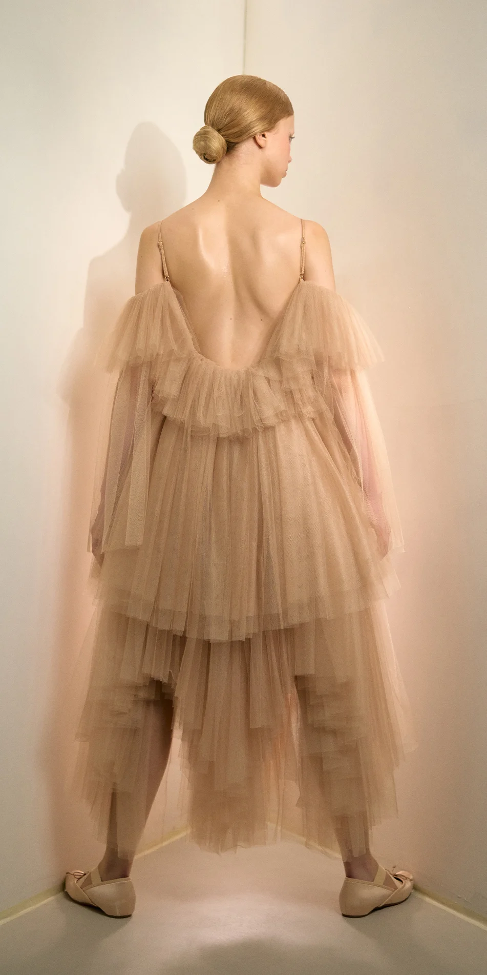 The Tulle Cloud Set brings together two signature pieces, creating a seamless, gown-like silhouette with dynamic movement. Inspired by the construction of classic tutus, they reinterpret layered draping into airy, cloud-like forms crafted from lightweight Italian tulle.