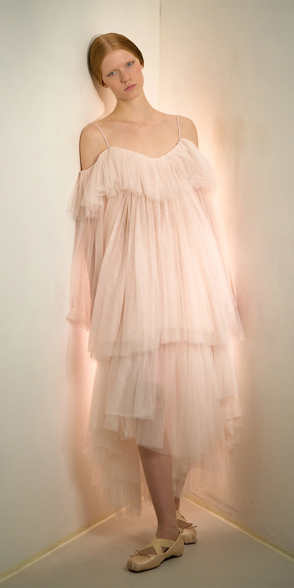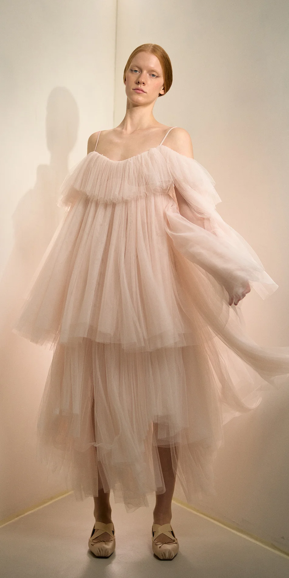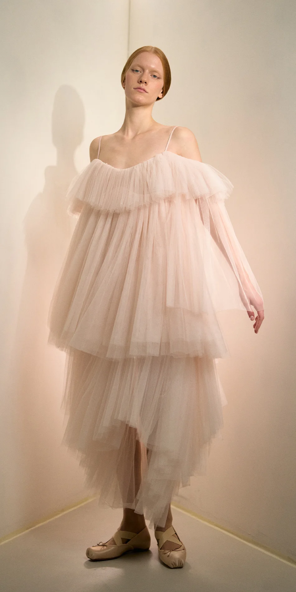The Tulle Cloud Set brings together two signature pieces, creating a seamless, gown-like silhouette with dynamic movement. Inspired by the construction of classic tutus, they reinterpret layered draping into airy, cloud-like forms crafted from lightweight Italian tulle.