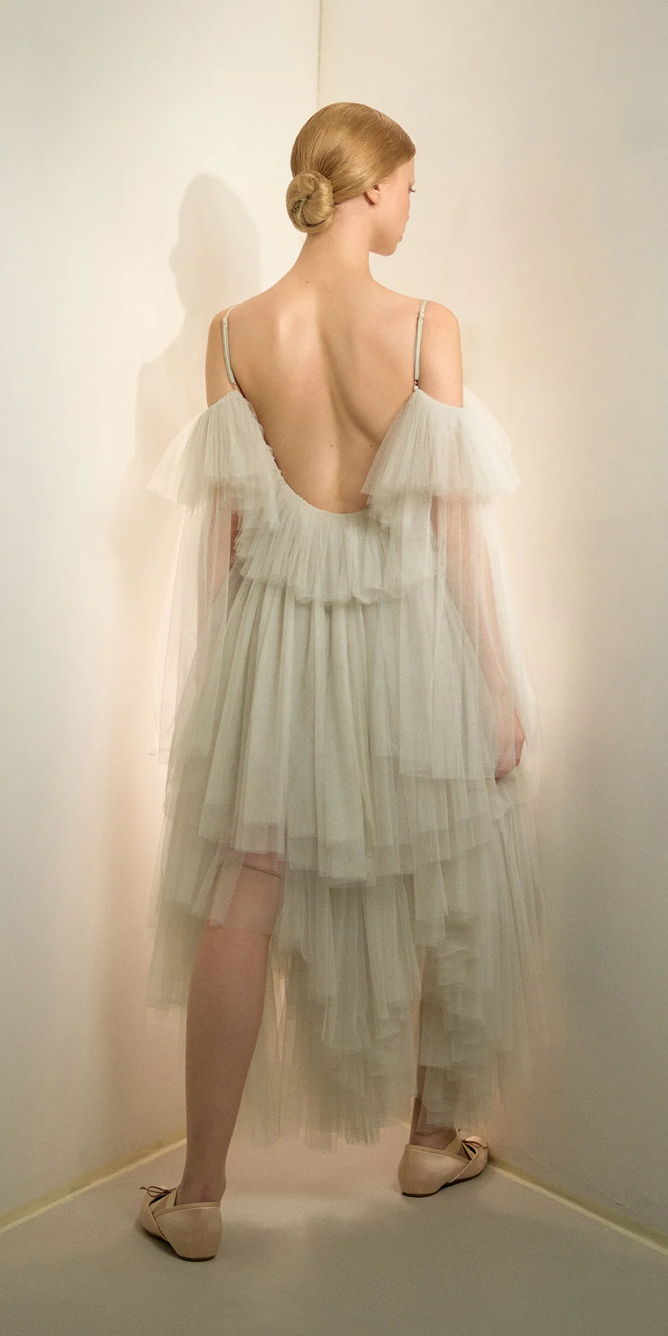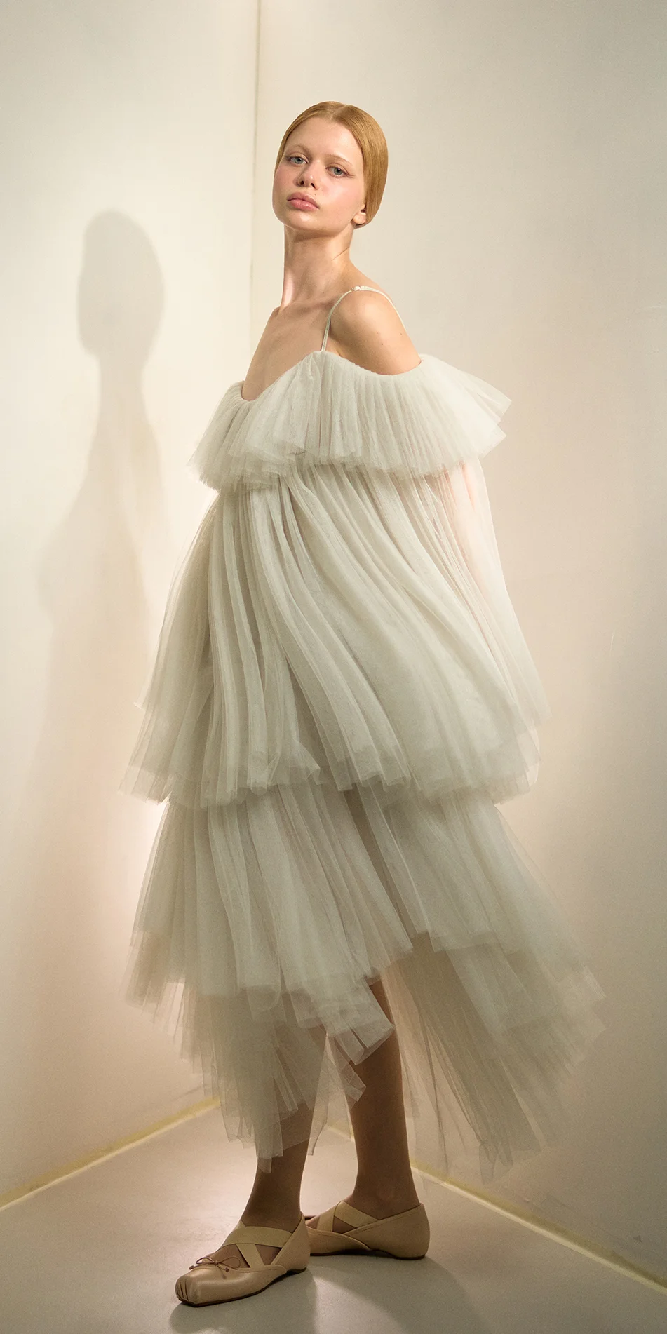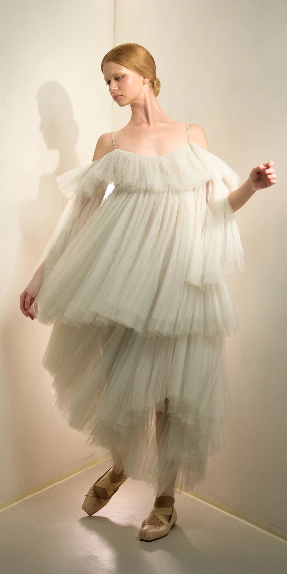 The Tulle Cloud Set brings together two signature pieces, creating a seamless, gown-like silhouette with dynamic movement. Inspired by the construction of classic tutus, they reinterpret layered draping into airy, cloud-like forms crafted from lightweight Italian tulle.