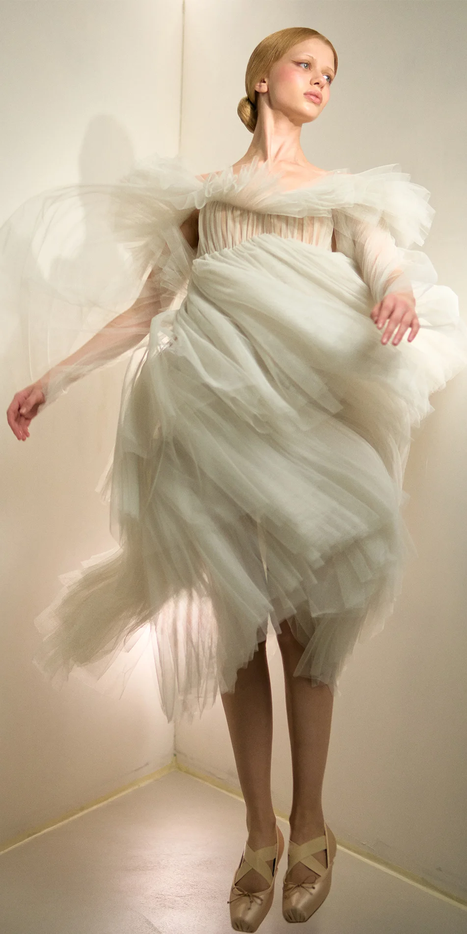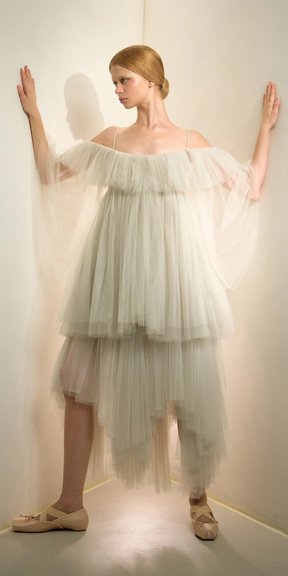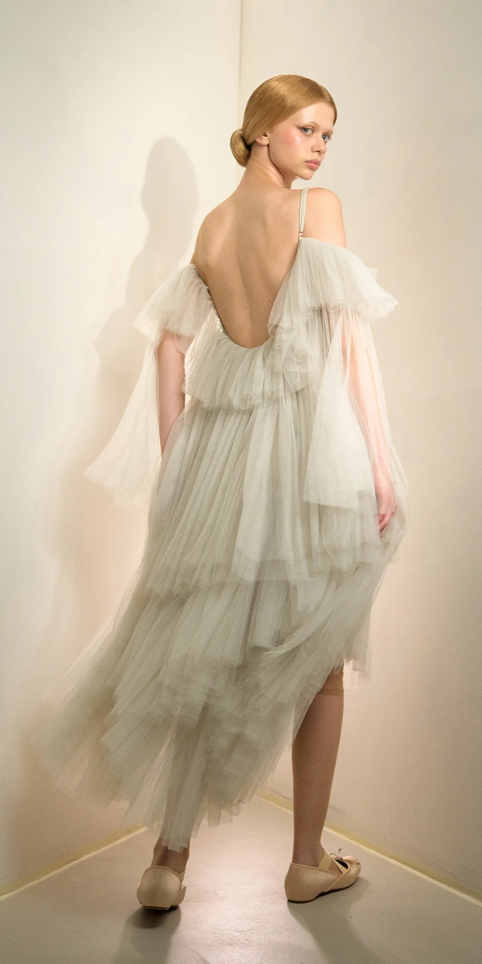 The Tulle Cloud Set brings together two signature pieces, creating a seamless, gown-like silhouette with dynamic movement. Inspired by the construction of classic tutus, they reinterpret layered draping into airy, cloud-like forms crafted from lightweight Italian tulle.