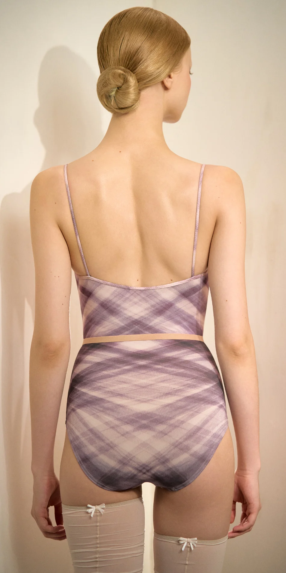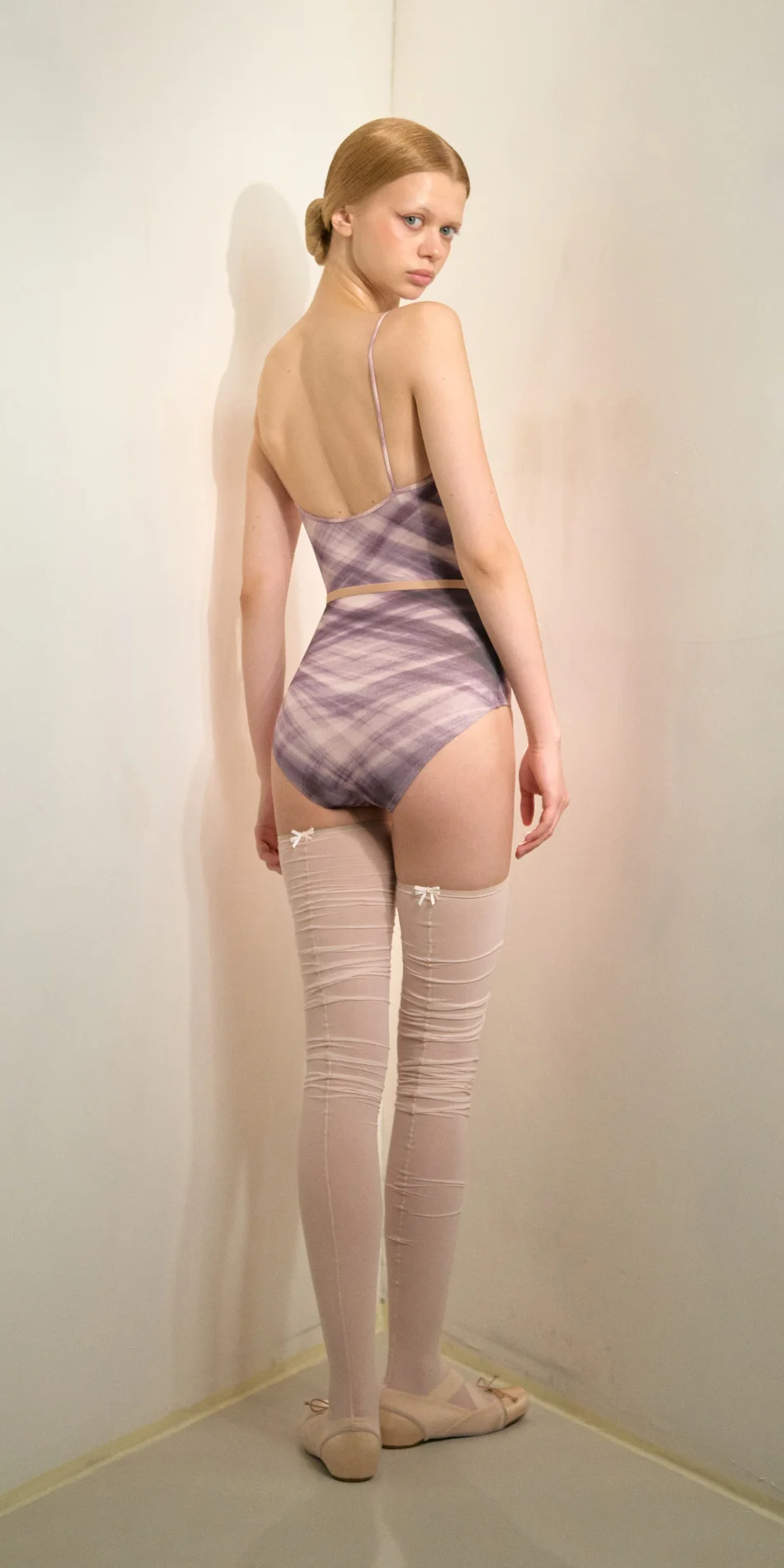 Where JAC’s signature printed design meets couture technique. The Tulle Plié leotard features a body-placed print created by draping tulle fabric on a mannequin and translating it into a flowing composition that sits naturally along the torso. Cut in a clean, classic camisole silhouette.