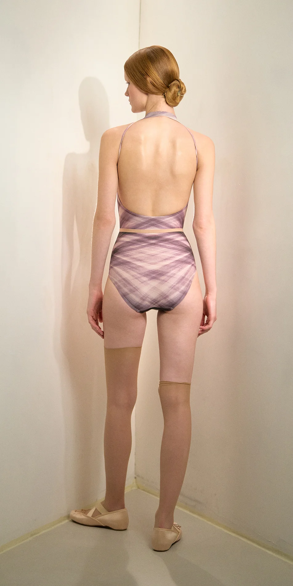 Where JAC’s signature printed design meets couture technique. The Tulle Plié leotard features a body-placed print created by draping tulle fabric on a mannequin and translating it into a flowing composition that sits naturally along the torso.