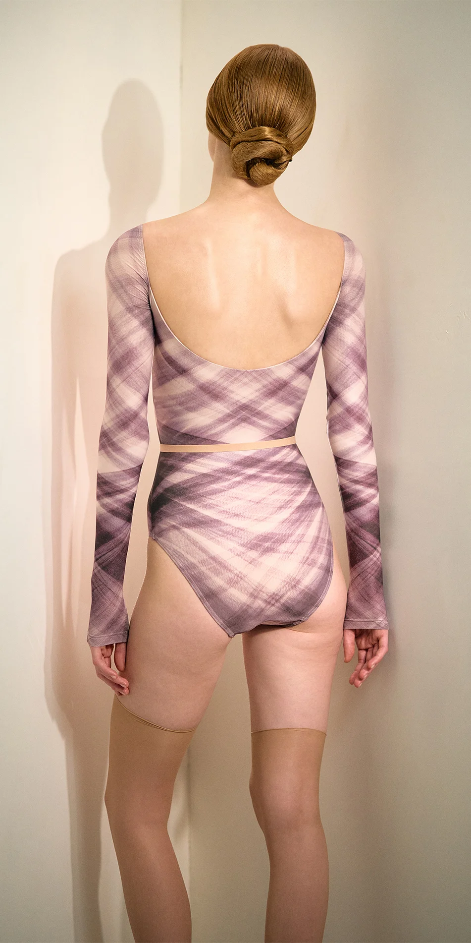 Where JAC’s signature printed design meets couture technique. The Tulle Plié leotard features a body-placed print created by draping tulle fabric on a mannequin and translating it into a flowing composition that sits naturally along the torso. Designed with a sweetheart neckline and long sleeves.