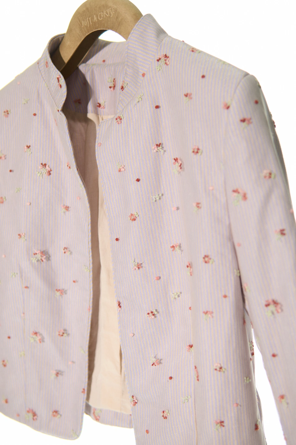 In candy-stripe poly-cotton twill covered with embroidered tulle.