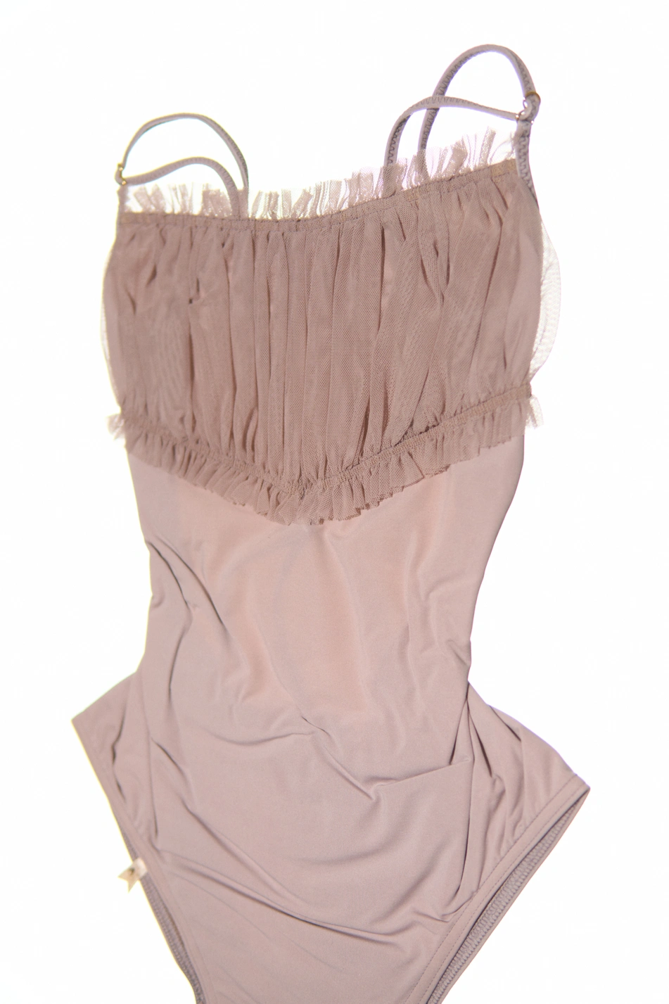 In double layered, certified/recycled superfine/second skin jersey and ruched stretch tulle.