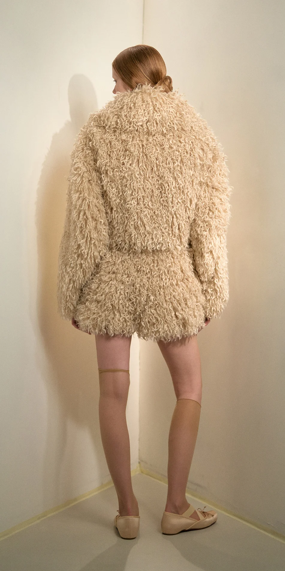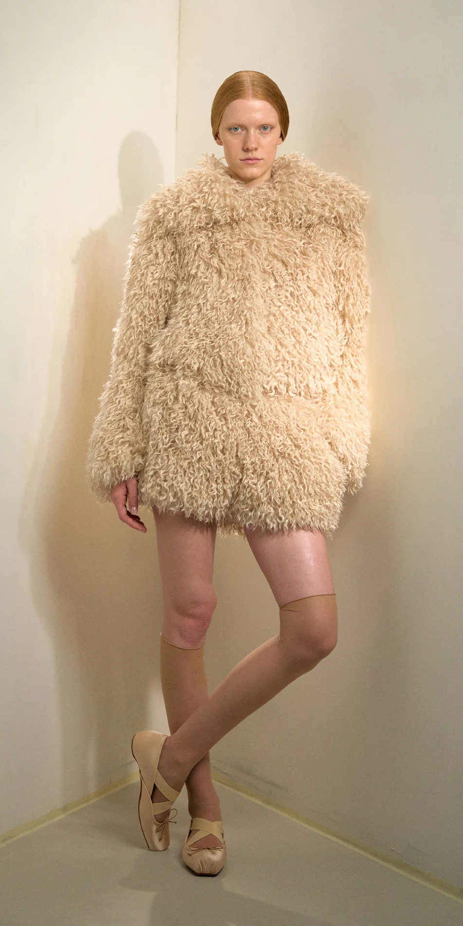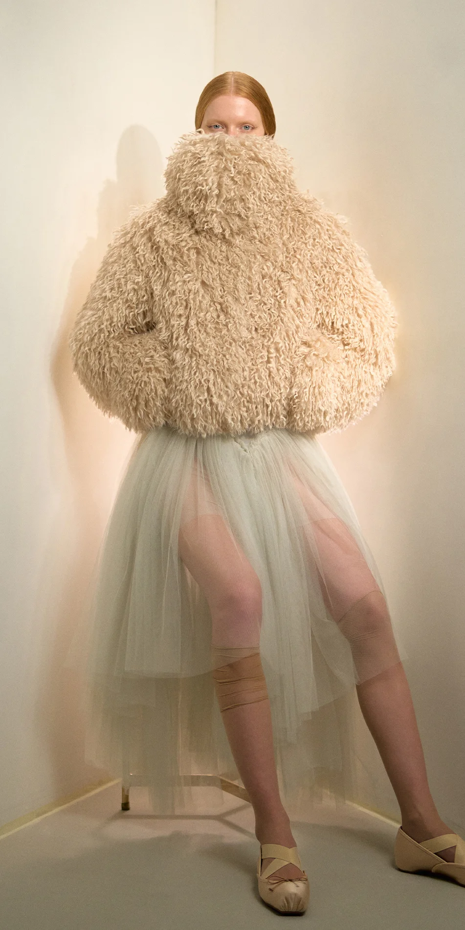Rooted in the tradition of a ballet warm-up pieces, this jacket amplifies volume, shape, and texture into a statement faux-fur piece with a distinctive, bold silhouette. The sleeves are anatomically cut to reflect a ballerina’s first-position posture.