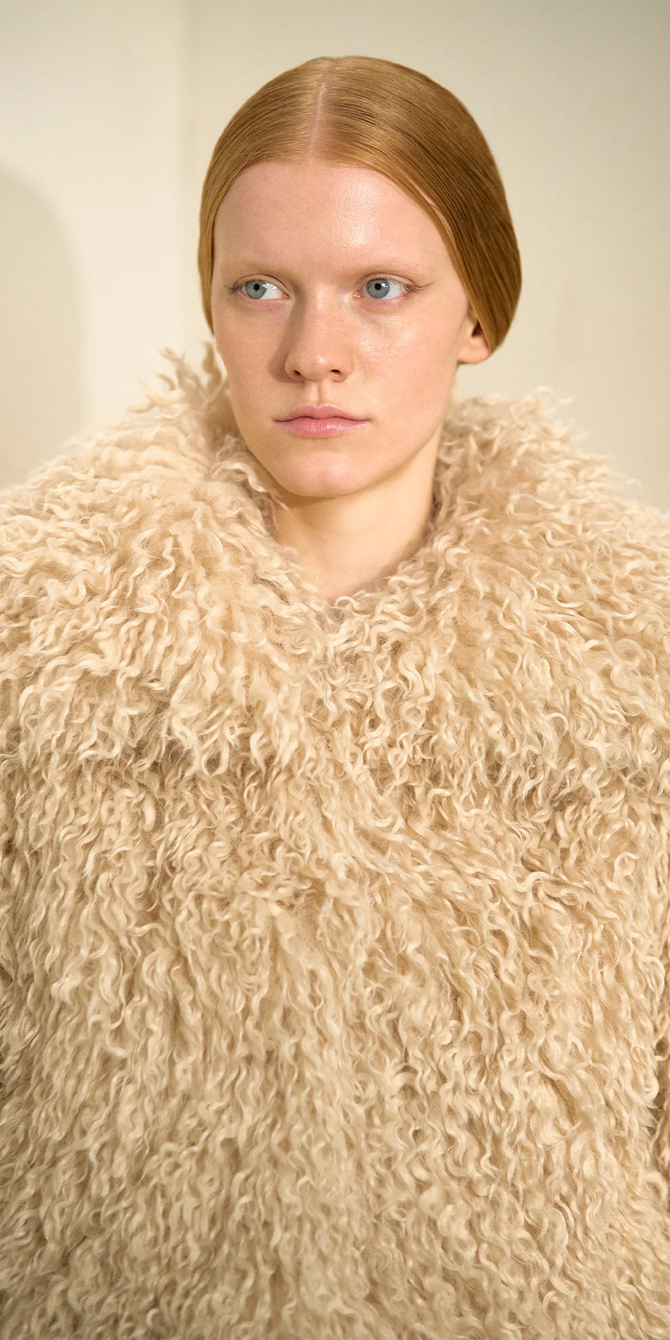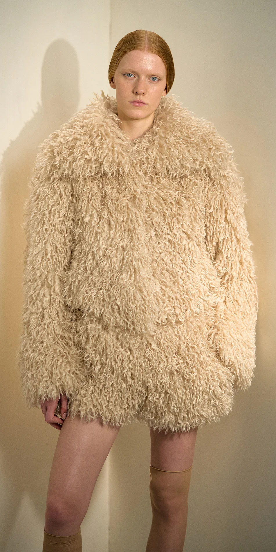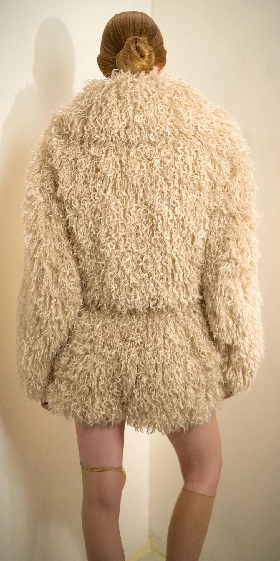 Rooted in the tradition of a ballet warm-up pieces, this jacket amplifies volume, shape, and texture into a statement faux-fur piece with a distinctive, bold silhouette. The sleeves are anatomically cut to reflect a ballerina’s first-position posture.